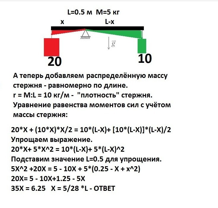 Однородный стержень длиной 1.5 м и массой 20 кг опирается на опору и находится в равновесии (см.рис.). На одном конце стержня (левее опоры) висит груз массой 80 кг, а на другом (правее опоры) – массой 40 кг. Найти расстояние между опорой и точкой подвеса груза массой 80 кг к стержню.