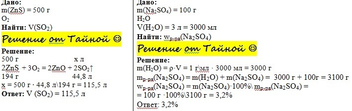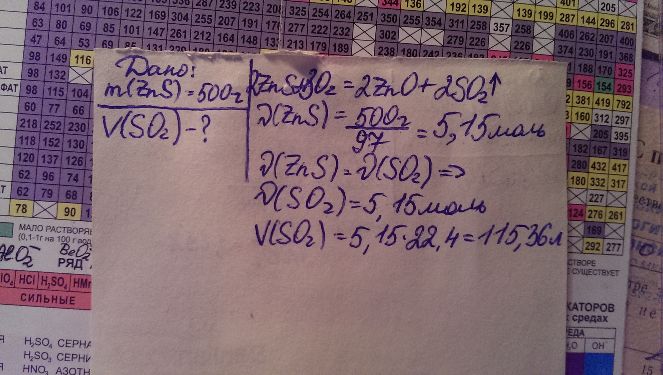 1) Сколько литров газа SO2 получится при обжиге 500г сульфида цинка (ZnS)?