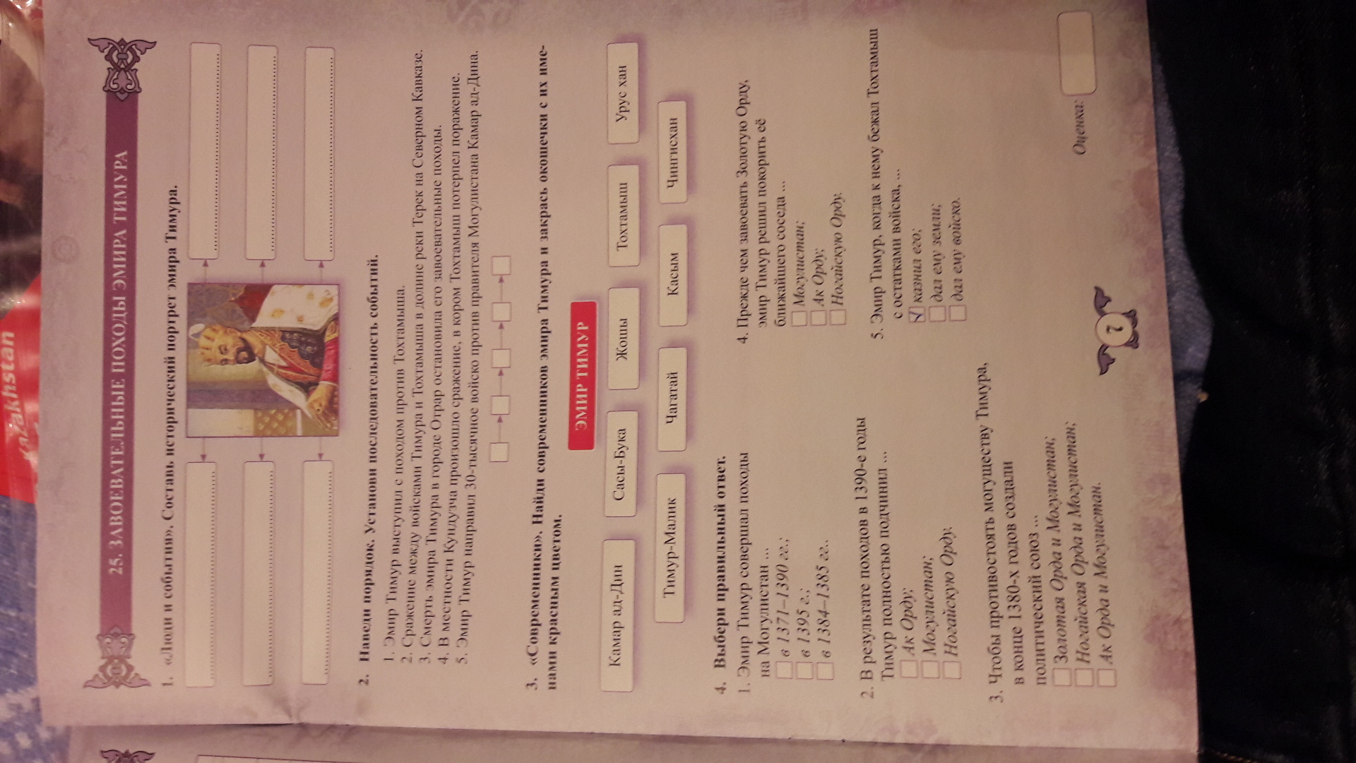 Эмир Тимур(1336-1405 гг.) из тюркизированного монгольского племени барлас. В 370 году эмир Тимурзахватил власть в Мавераннахре, которым правил в течение 35 лет, вплоть до самой смерти в 1405году. Прежде, чем завоевать Золотую Орду, эмир Тимур решил покорить ее ближайшего соседа - Белую Орду. К Тимуру бежал из Белой Орды Тохтамыш- сын казненного Урус ханом правителя Мангистау. Тимур выделил Тохтамышу войско для захвата Белой Орд. В 1377 году Урус хан умер. Тимур посадил на ханский трон в Сауране Тохтамыша, а сам вернулся в Мавераннахр. Сын Урус хана, Тимур-Маликв 1377 году нанес поражение Тохтамышу у Саурана. Только в 1379г. после победы над Тимур-Маликом, Тохтамыш захватил Сыгнак и мог считать себя правителем Белой Орды. В 1380году Тохтамыш захватил Сарай, Хаджи-Тархан, Крым, Орду Мамая. Но объединение под властью Тохтамыша Золотой и Белой Орд угрожало могуществу власти эмира Тимура. Между Тимуром и Тохтамышем началась продолжительная борьба что способствовало освобождению русских земель. В 1395году в долине реки ерек на Северном Кавказе Тохтамыш потерпел сокрушительное поражение. Тимур захватил и разрушил столицу Золотой Орды Сарай-Берке. После этого экономическое положение Золотой Орды окончательно пришло в упадок, В 1371-1390 годах эмир Тимур неоднократно совершал походы на Могулистан. Чтобы противостоять могуществу эмира Тимура, правители Белой Орды и Могулистана в конце 1380-х годов создали политический союз. В ответ Тимур в 1384-1391 годах совершил ряд походов против Золотой Орды и Могулистана В результате походов в 1390-е годы Тимур полностью подчинил Могулистан. Лишь смерть эмира Тимура в 1405году в Отрареостановила его завоевательные походы. Эти походы вызвали пагубные последствия: значительно уменьшилась численность населения, пришло в упадок хозяйство, были прерваны связи с другими народами и странами.