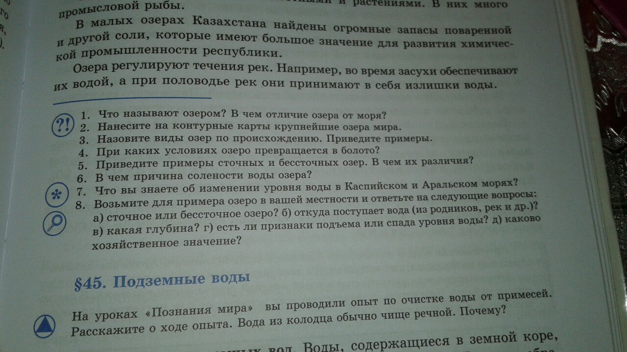 д) В озере пресная вода, вокруг него находятся поселения, может использоваться для питья, ловли рыбы, других животных или растений, для скота и т.д.