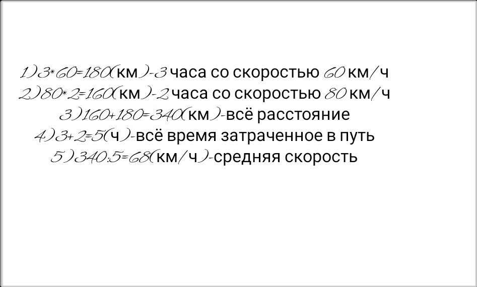 Автомобиль первые 3часа проехал со скоростью 60км/ч, а оставшиеся 2часа-со скоростью 80км/ч. Какова средняя скорость движения(км/ч)?