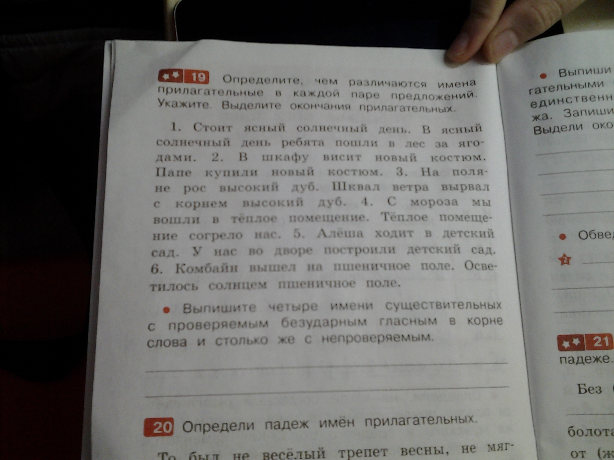 Упражнение номер 19. Пж помогите. Можно написать кратким ответом. И да извините за пальцы в кадре