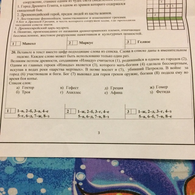 Это вариант 3. " Илиада" и " Одиссея" - это знаменитые поэмы ГОМЕРА. Он родился в ГРЕЦИИ. У АХИЛЛЕСА мать- ФЕТИДА. А ГЕКТОР убил Патрокла. Это была война за город ТРОЯ. Бог ГЕФЕСТ выковывал оружие, а богиня АФИНА дала копьё.