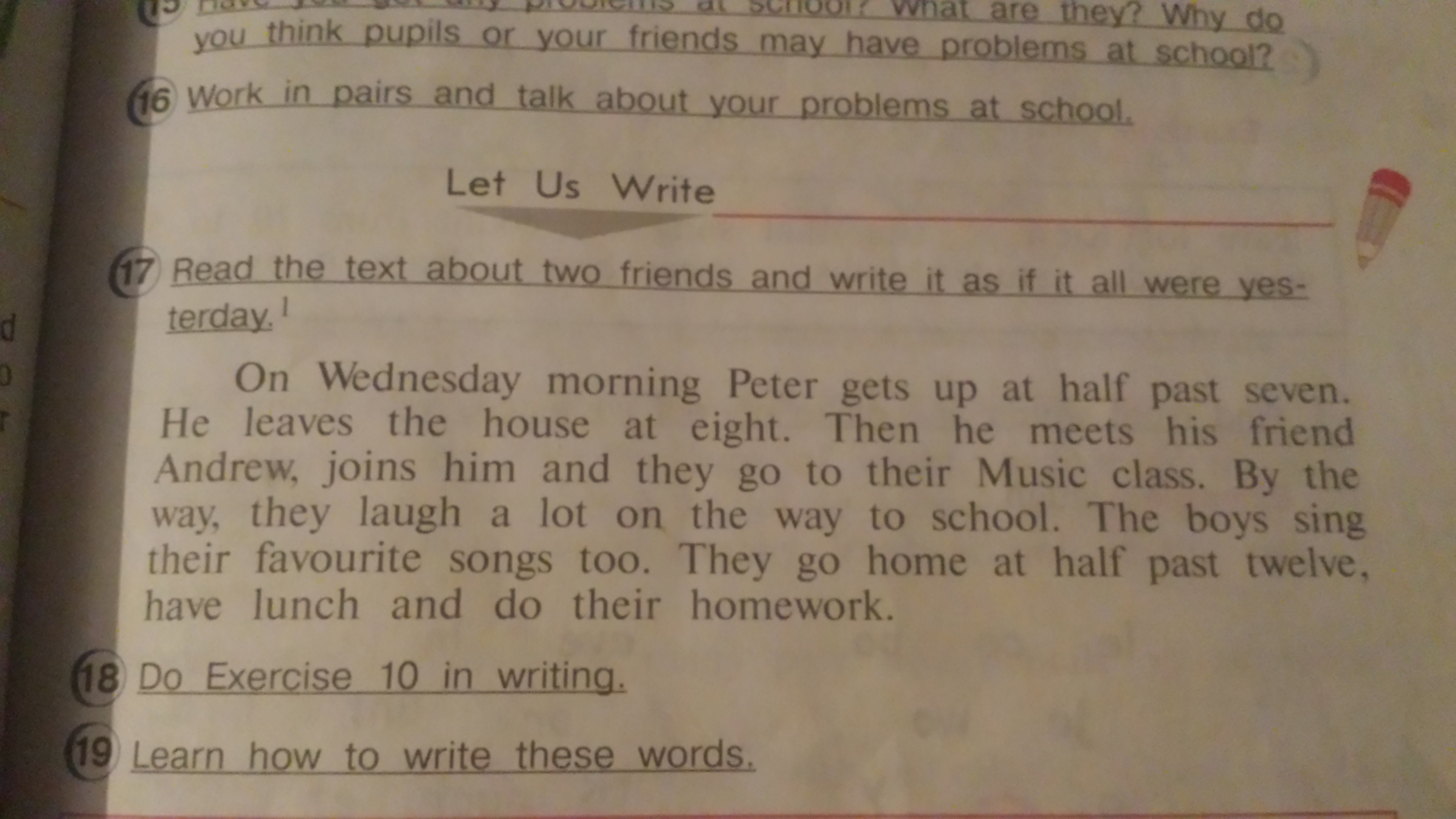 В среду утром Питер встает в половине восьмого. Он выходит из дома в восемь. Затем он встречает своего друга Эндрю, присоединяется к нему, и они шли на музыкальном классе. Кстати, они смеются много на пути в школу. Ребята тоже поют свои любимые песни. Они идут домой в половине первого, обед и сделать свою домашнюю работу.