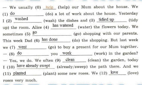 Обычно, мы помогаем нашей маме по дому. Мы делаем разную работу по дому. Вчера я помыл посуду и убрался в комнате. Алиса полила цветы сегодня. Иногда, мы идем за покупками с родителями. На этой неделе, папа ходил за покупками. Но на прошлой недели, мы ходили вместе, чтобы купить маме подарок.