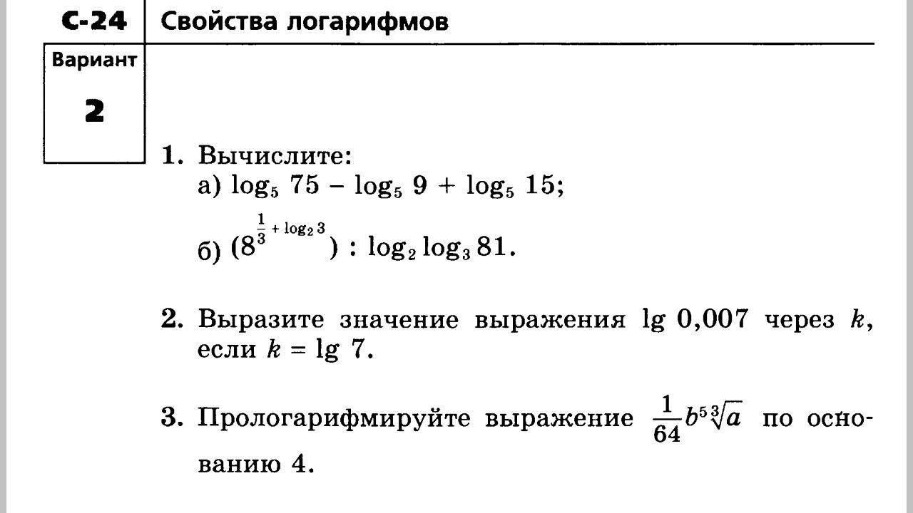1.\a);log_575-log_59+log_515=log_5frac{75cdot15}9=log_5125=3\b);left(8^{frac13+log_23}right):log_2log_381=left(8^{frac13}cdot8^{log_23}right):log_2log_3(3^4)=\=left(2cdot2^{3log_23}right):log_24=left(2cdot2^{log_23^3}right):log2(2^2)=left(2cdot27right):2=27\\2.;lg0,007=lg(7cdotfrac1{1000})=lg(7cdot10^{-3})=lg7+lg(10^-3)=\=lg7-3lg10=lg7-3=k-3