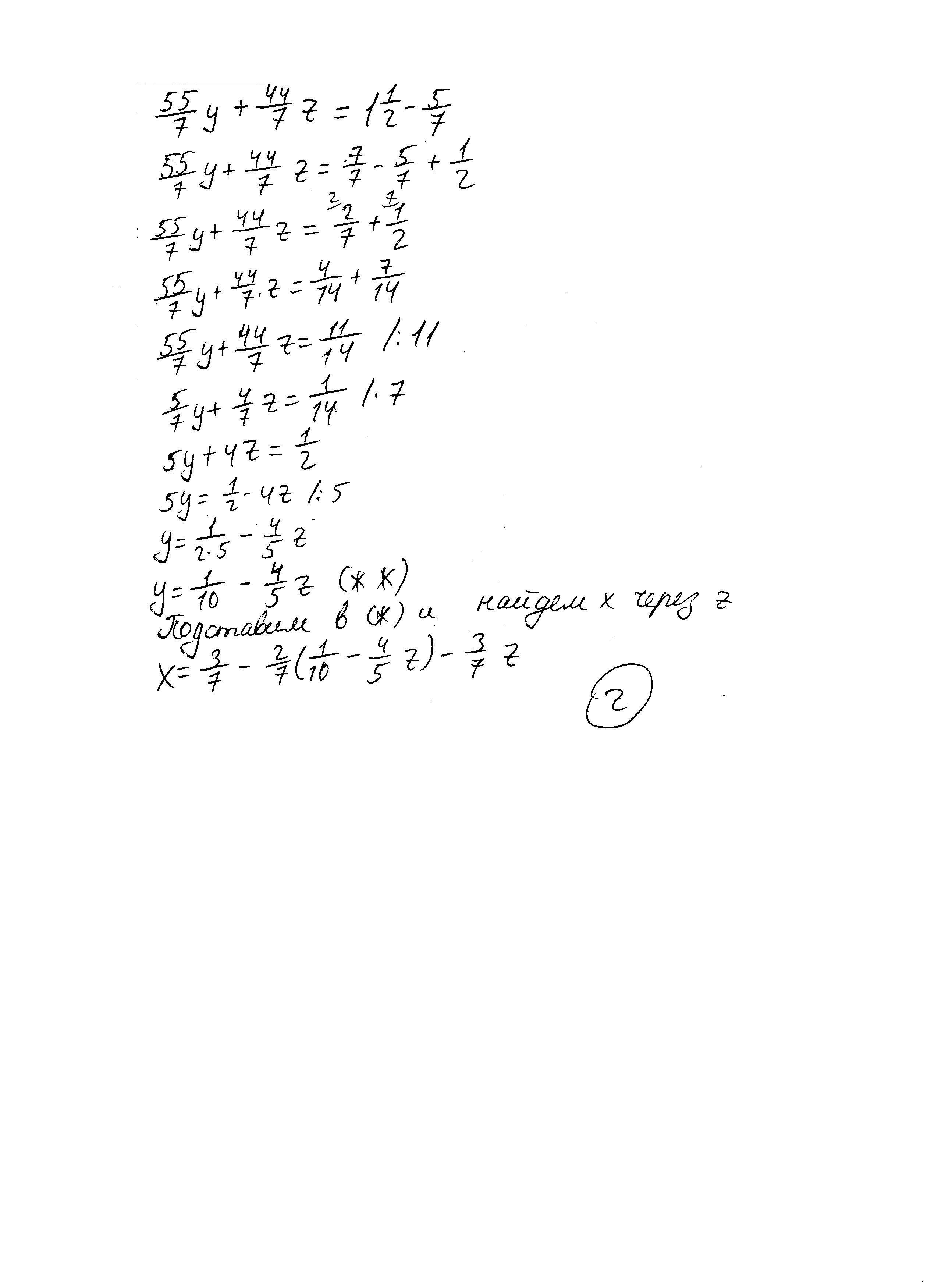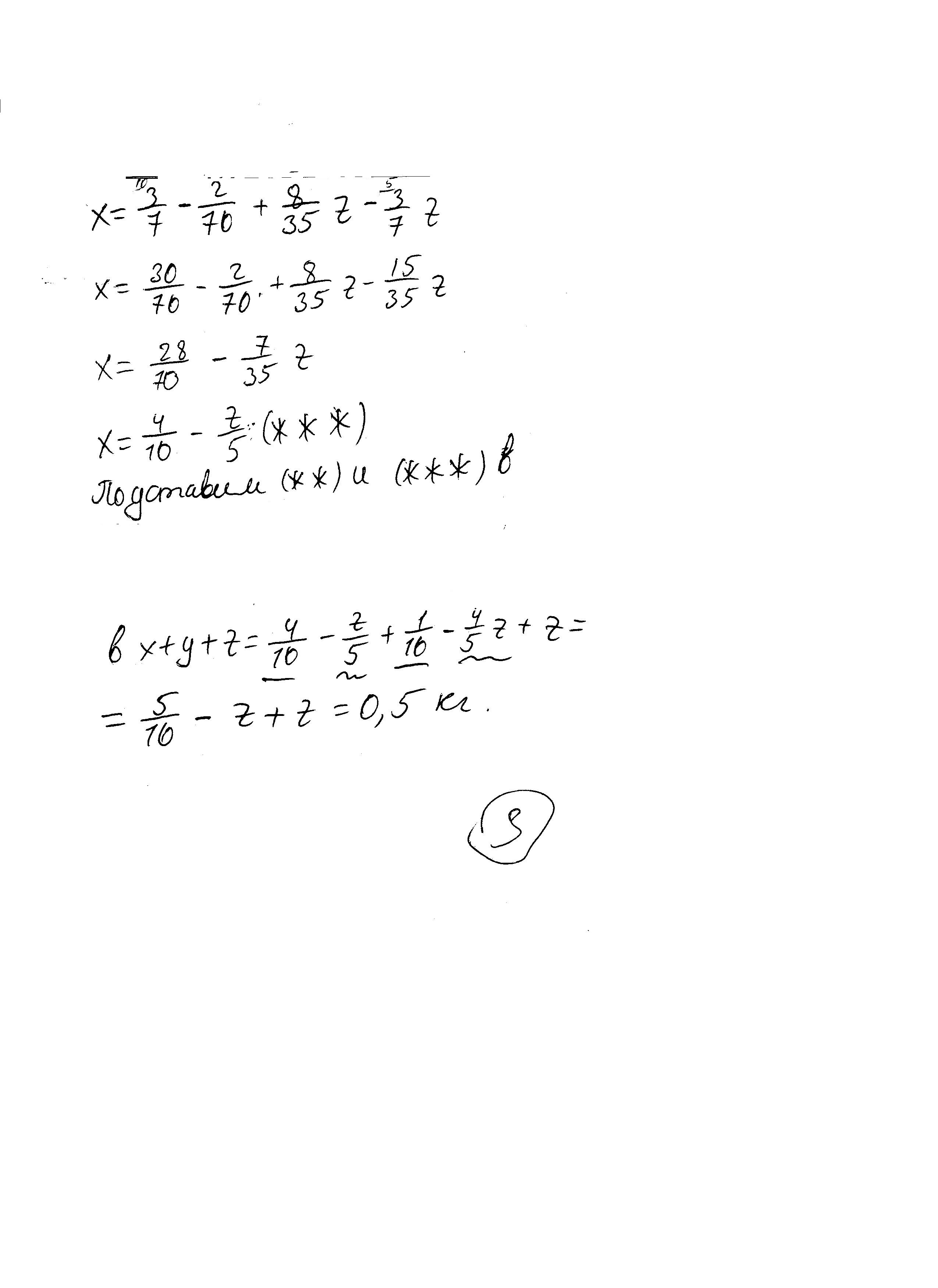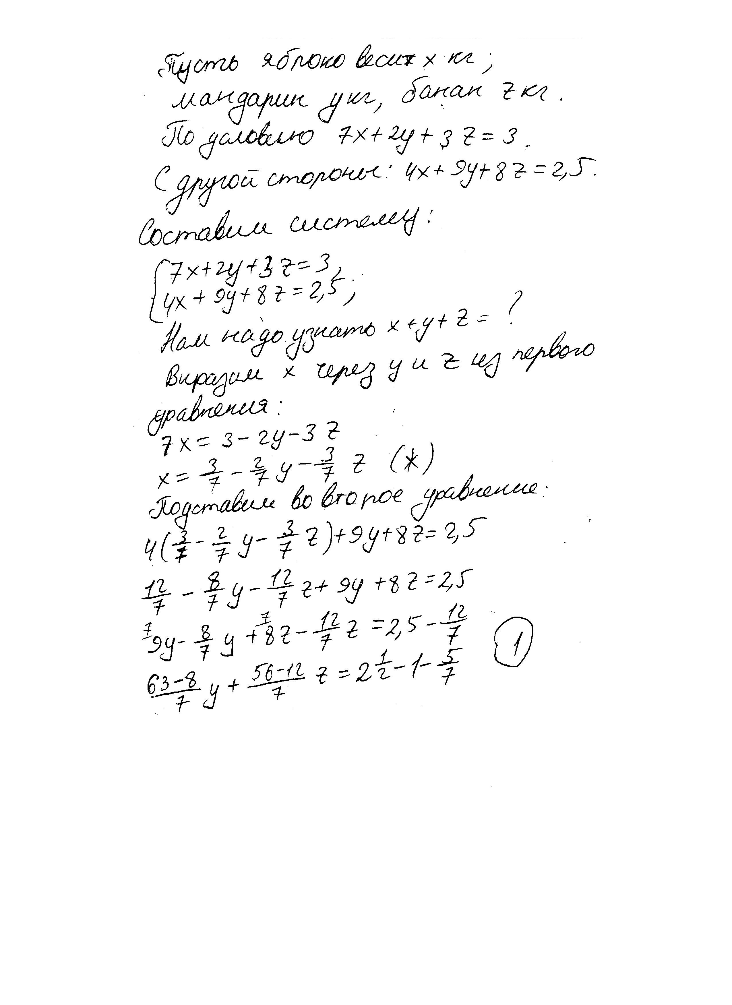 В магазине в отделе фрукты и овощи стоят неисправные весы они верно взвешивают продукты только от 1 кг. при взвешивании 7 яблок 2 мандаринов и 3 бананов весы показывают 3 кг. при взвешивании 4 яблок 9 мандаринов и 8 бананов весы показывают 2.5 кг. Сколько весят вместе одно яблоко один мандарин и один банан?