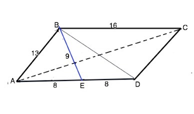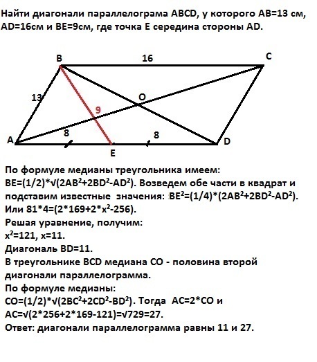 Найти диагонали параллелограма ABCD, у которого AB=13 см, AD=16СМ и BE=9СМ, где точка E середина стороны AD.