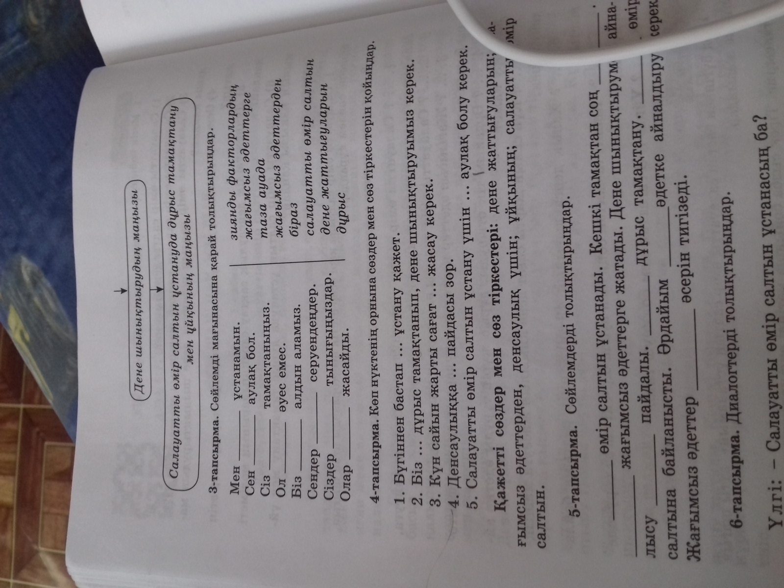 Мен салауатты өмір салтын ұстанамын. Сен жағымсыз әдеттерден аулақ бол. Сіз дұрыс тамақтаныңыз. Ол жағымсыз әдеттерге әуес емес.Біз зиянды факторлардың алдын аламыз. Сендер таза ауада серуендеңлер. Сіздер біраз тынығыңыздар. Олар дене жаттығуларын жасайды