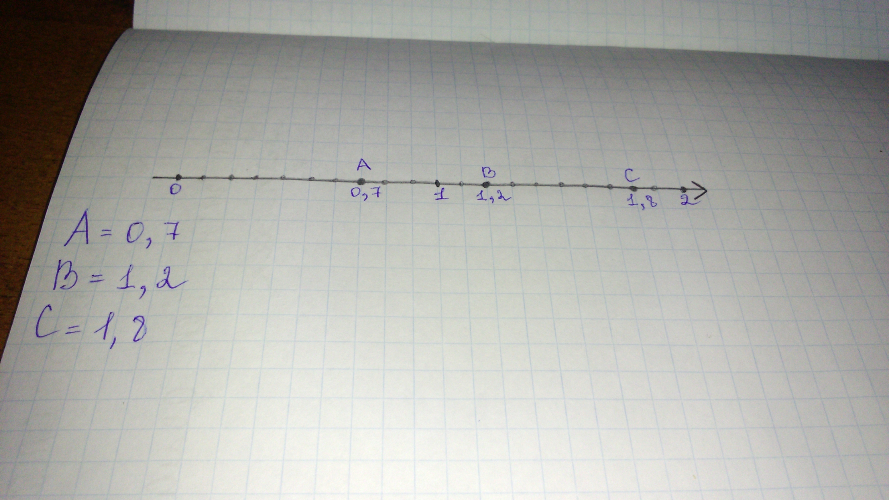 примите за единичный отрезок длинну десяти клетокэтетради и отметьте на координатном луче точки:А(0,7);В(1,2); С(1,8)