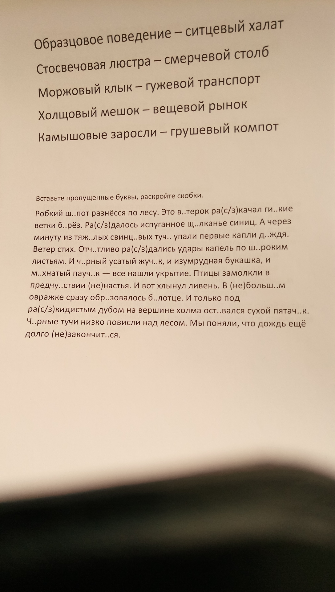 Робкий шёпот разнёсся по лесу. Это ветерок раскачал гибкие ветки берёз. Раздалось испуганное щёлканье синиц. А через минуту из тяжёлых свин- цовых туч упали первые капли дождя. Ветер стих. Отчётливо раздались удары капель по широким листьям. И чёрный усатый жучок, и изумрудная букашка, и мохнатый паучок — все нашли укры- тие. Птицы замолкли в предчувствии ненастья.