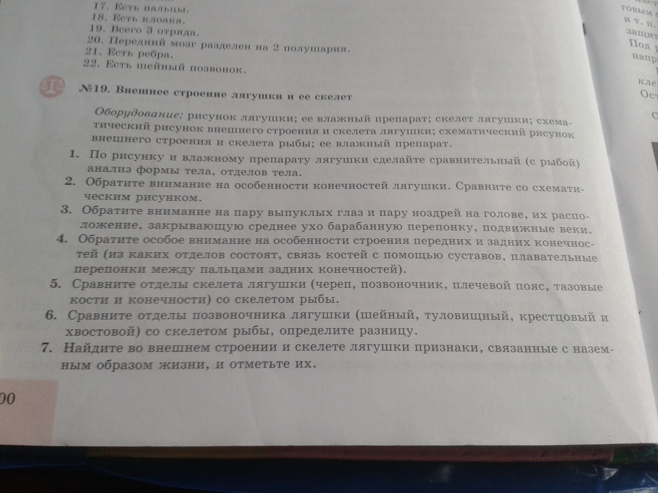 1. Скелет рыб тяжелее. У него отсутствуют пояса конечностей. У рыб- 2 отдела позвоночника, у земноводных -3. Череп рыб неподвижно причленён к позвоночнику, у земноводных есть 1 шейный позвонок. У рыб есть рёбра, у земноводных рёбра отсутствуют.