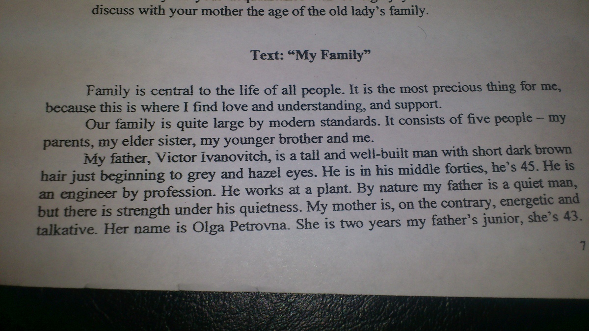 Мой папа, Виктор Иванович, высокий и статный мужчина с короткими коричневыми волосами, которые начали седеть, и карьими глазами. Ему 45 лет. По профессии он инженер. Работает он на заводе. По сущности мой отец очень спокойный и тихий, но под его сдержанностью таится огромная сила. Моя мама, на оборот, энергетик и очень любит поболтать. Её имя Ольга Петровна. Моя мама младше папы на два года. Ей 43.