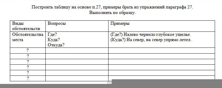 Виды обстоятельств Вопросы Примеры