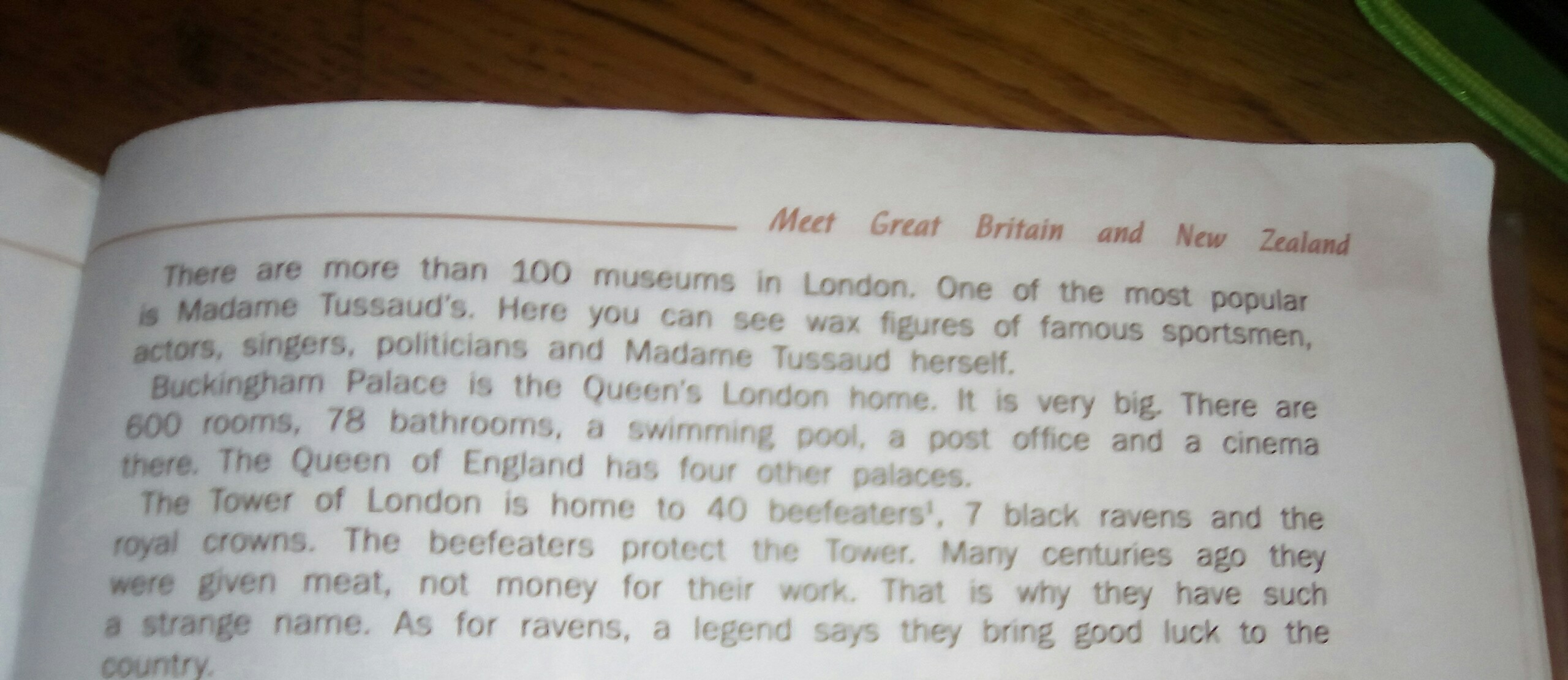 Лондонский Тауэр это дом 40 бифитеров, семи чёрных ворон и королевских корон. Бифитеры защищают Тауэр. Много веков назад за их работу им давалось мясо, не деньги. Поэтому они имеют столь странное название. Что касается ворон, легенда гласит, что они приносят удачу стране.