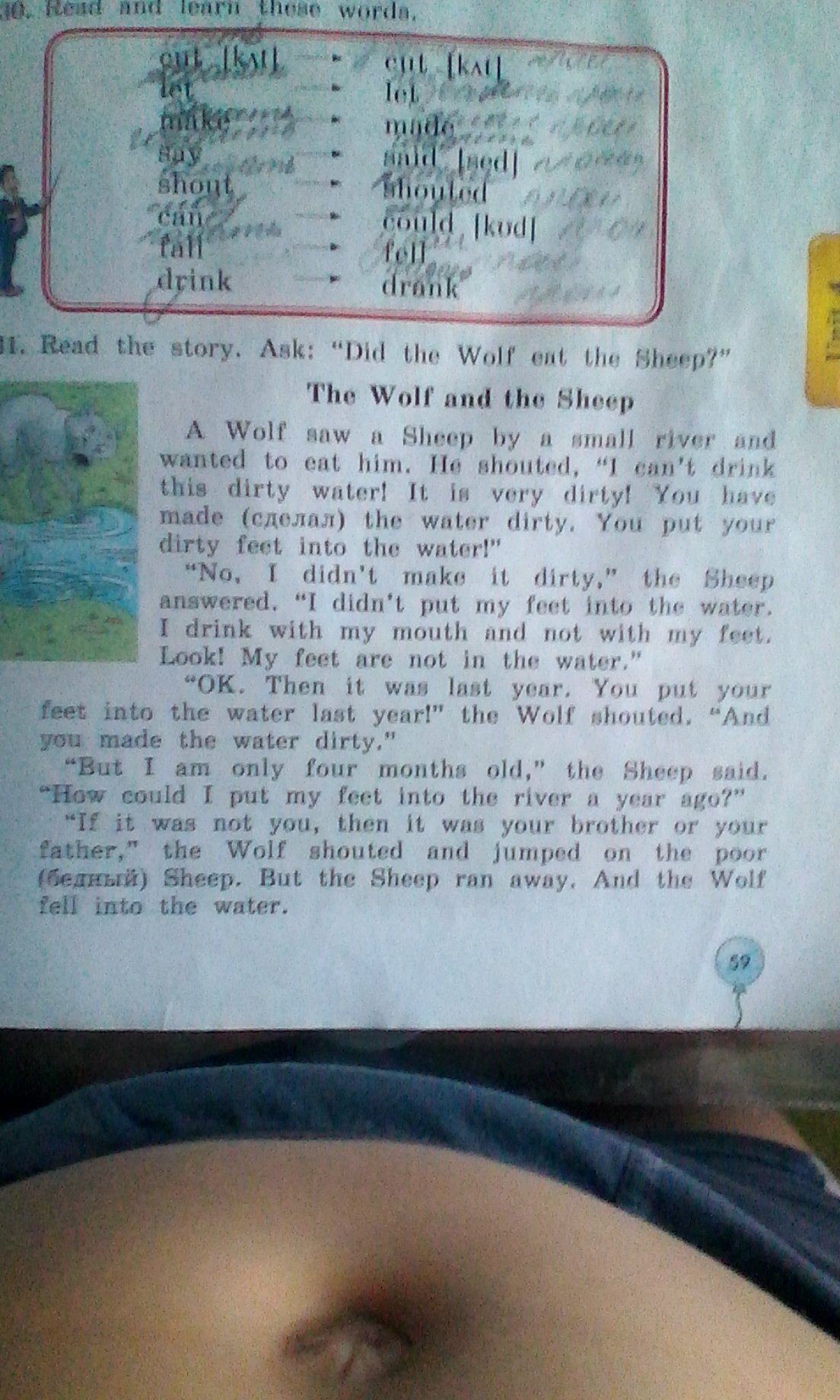 - Нет, я ее не мутила, - ответила овца. Я не входил в воду. Я пью воду, но не пачкую ее своими ногами. Посмотрите! Мои ноги не в воде. - ответила овечка.