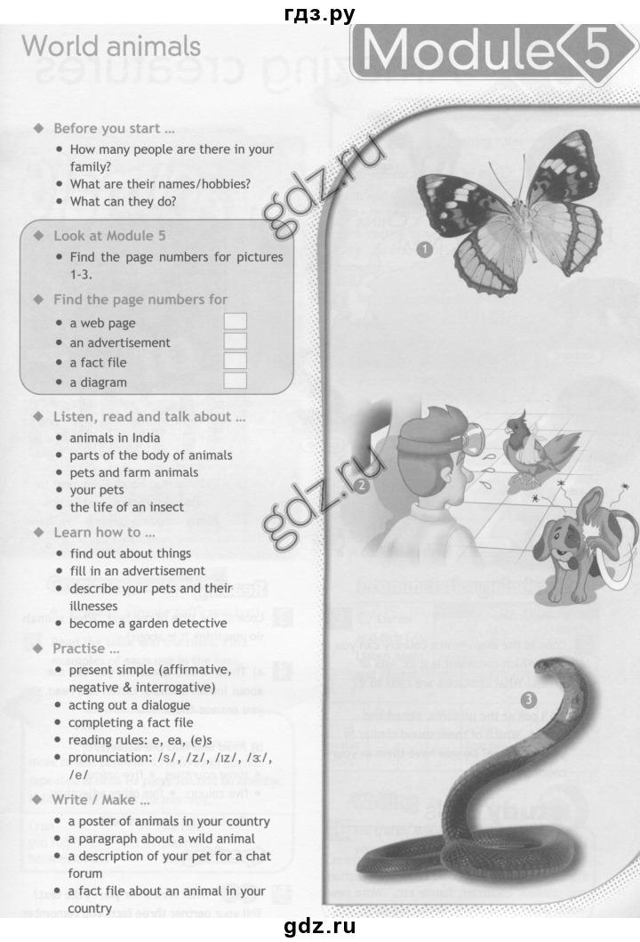 Перед тем, как начать Сколько людей есть в вашей семье? Каковы их имена хобби? Что они могут сделать? Посмотрите на Модуль 5 Найти номера страниц для фотографий Найдите числа страниц для веб-страницы е объявление факт файл схема, Слушайте, читайте и говорить. животные в Индии е частях тела животных домашних животных и сельскохозяйственных животных ваших домашних животных из жизни насекомого Узнайте, как узнать о вещи наполняют в рекламе описывают ваши домашние животные и их болезни становятся сад детектив электронной Практикуйте настоящий простой (положительный, отрицательный вопросительное) разыгрывая диалог завершая факт чтения файла nutes е, еа, произношение: LST, Zi / ХТ. / 3 / запись Сделайте плакат животных в вашей стране пункт о диким животным описание вашего питомца на форуме чата факт файла о животном в вашей стране