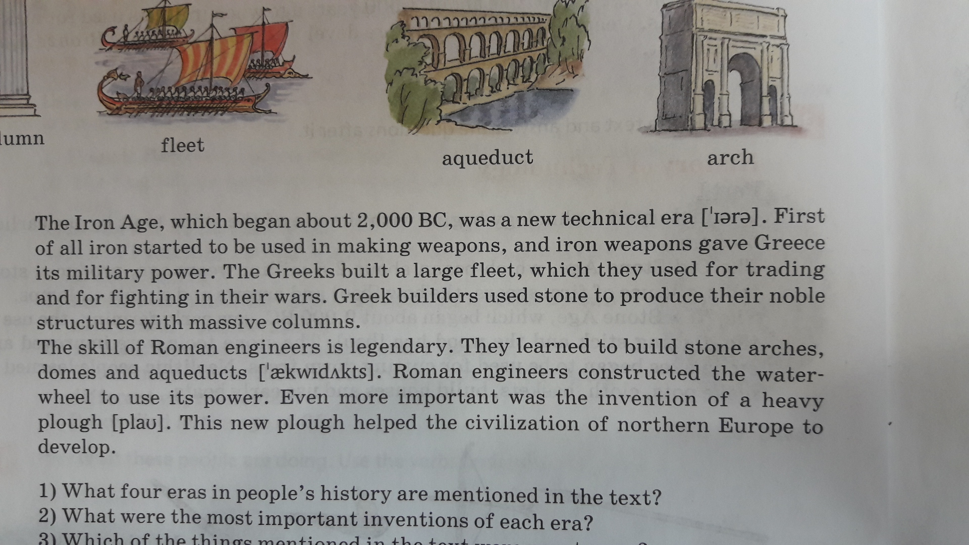 Железный век, который начался около 2000 г. до н.э., была новая техническая эра l'хара] Прежде всего железа стали использоваться в производстве оружия, и железное оружие дал Греции свою inilitary силу. Греки построили большой флот, который они использовали для торговли и для боевых действий в их войнах. Греческие строители использовали камень, чтобы произвести их благородные структуры с массивными колоннами Мастерство римских инженеров iegendary. Они научились строить каменные арки, купола и акведуки l'aekwidAktsl. Римские инженеры построили Водо- колесо, чтобы использовать его силу. Еще более важным было изобретение тяжелого plou [plaul. Этот новый плуг помог цивилизации Северной Европы развивать I) Какие четыре эпохи в истории народа упоминаются в тексте? в были самыми важными изобретениями каждой эпохи?