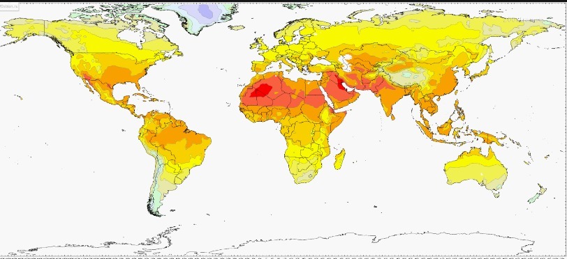 Смотрим на вторую карту. Самые жаркие территории - это пустыня Сахара в Африке и Саудовская Аравия. Эти территории находятся в области высокого давления (то есть воздушные массы опускаются вниз, уходят еще больше от точки насыщения водяными парами, а значит, осадкам взяться там неоткуда). Большая протяженность с запада на восток уменьшает и воздействие окружающих материк океанов. Безоблачное небо (отсутствие водяного пара в воздухе) позволяет свободно проникать лучам Солнца на земную поверхность, а песок очень мало отражает солнечных лучей. Таким образом еще больше увеличивая прогревание земли, а от нее и атмосферы.