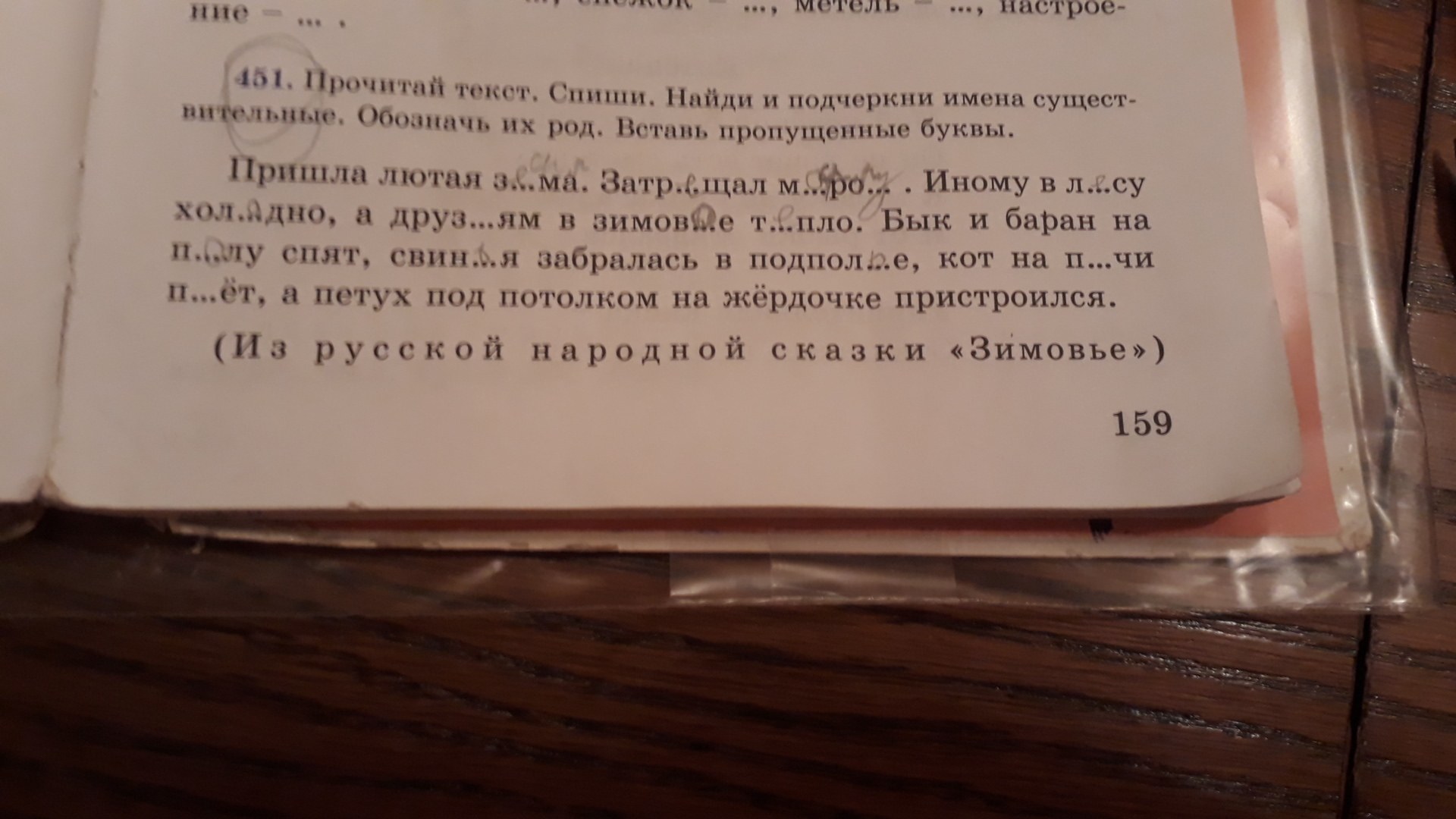 Зима ,затрещал,мороз,лесу,Холодно,друзьям,зимовье,тепло,полу,свинья, подполье,печи,поет. Имена сущ.-зима(жен),мороз(муж),Бык(муж),баран(муж) свинья (жен),кот( муж),петух(муж).