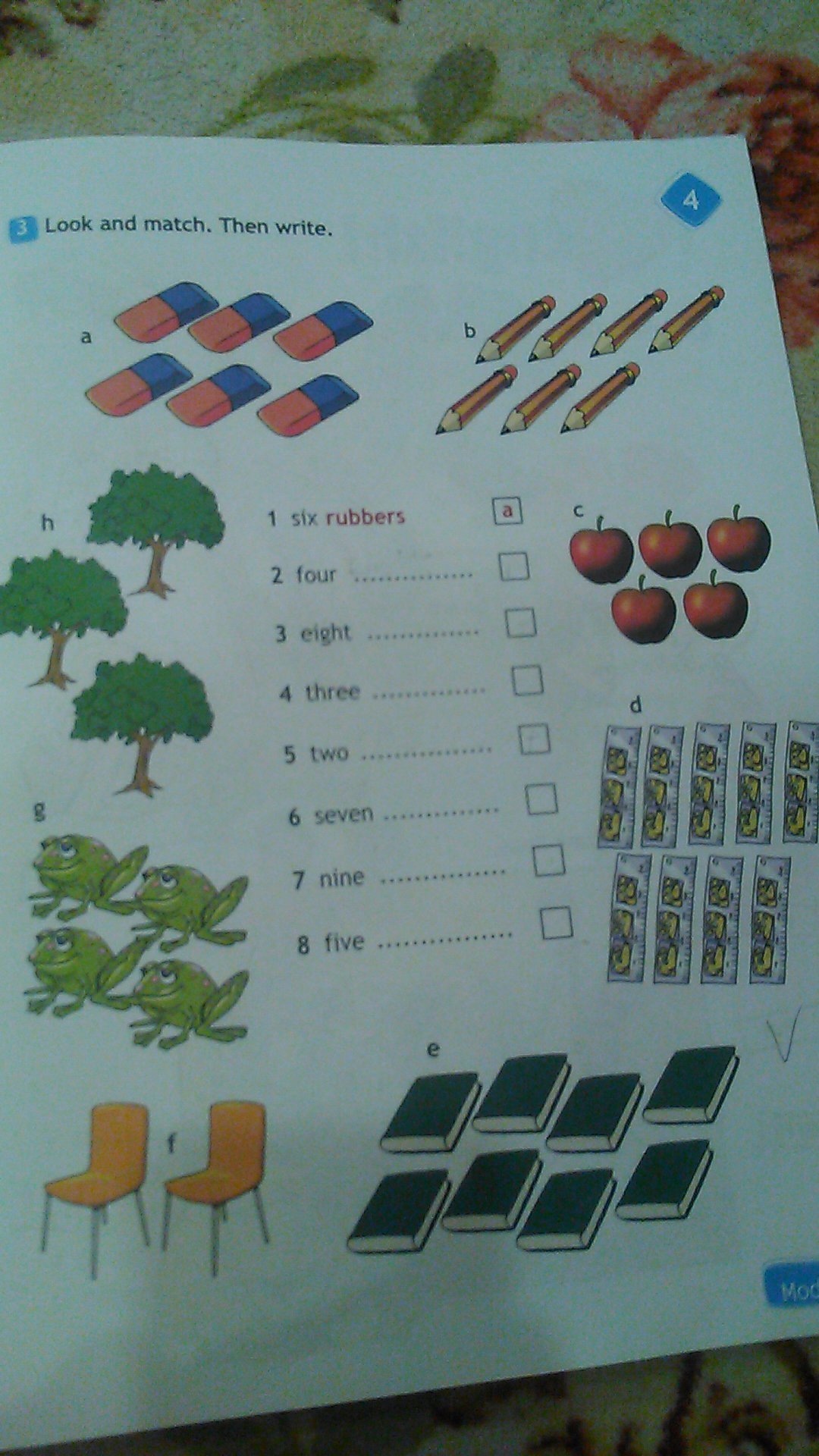 Во втором 2 лягушки,в третем 8 книг ,в четвертом 3 дерева,в пятом 2 стула ,в шестом 6 карандашей ,в седьмом буква d,в восьмом 5 яблок .Зарание пожалуйста!!