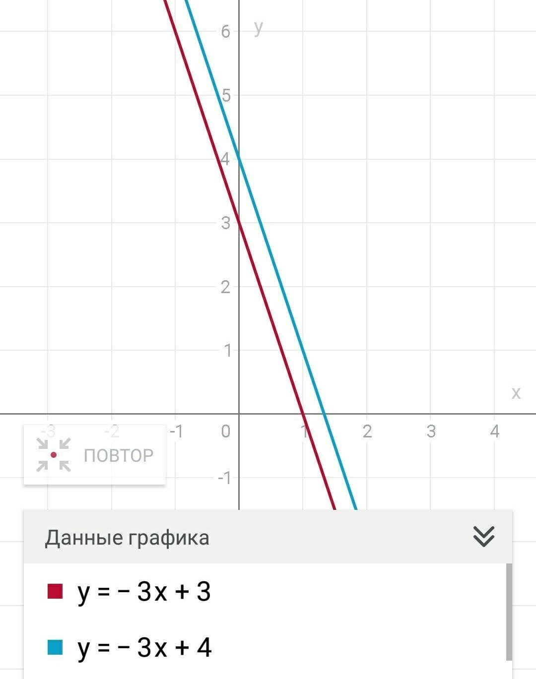 запишите функцию график которой параллелен графику функции у=-3х+4 и пересекает ось ординат в точке B(0;3)