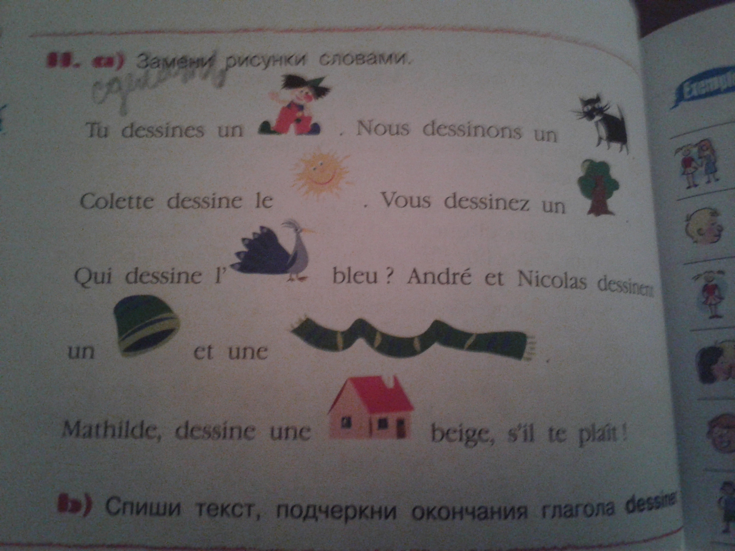 le clown,le chat,le soleil,l`arbre,le faisan,chapeau,écharpe,maison