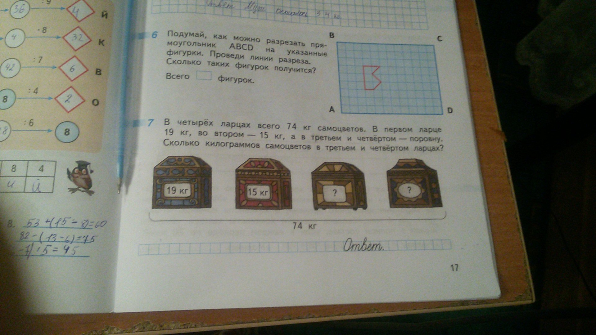 3)40:2=20кг Ответ: 20 кг в 3 и 4 ларцах