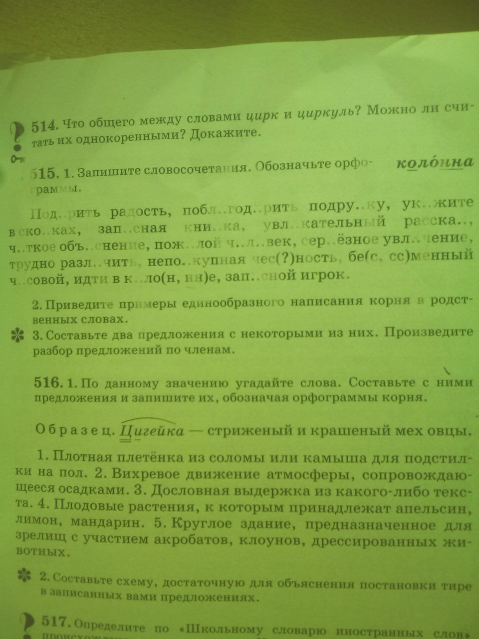 515. Подарить радость, поблагодарить подружку, укажите в скобках, записная книжка, увлекательный рассказ, чёткое объяснение,пожилой человек, серьёзное увлечение, трудно различать, неподкупная честность, бессменный, часовой, идти в колонне, запасной игрок.