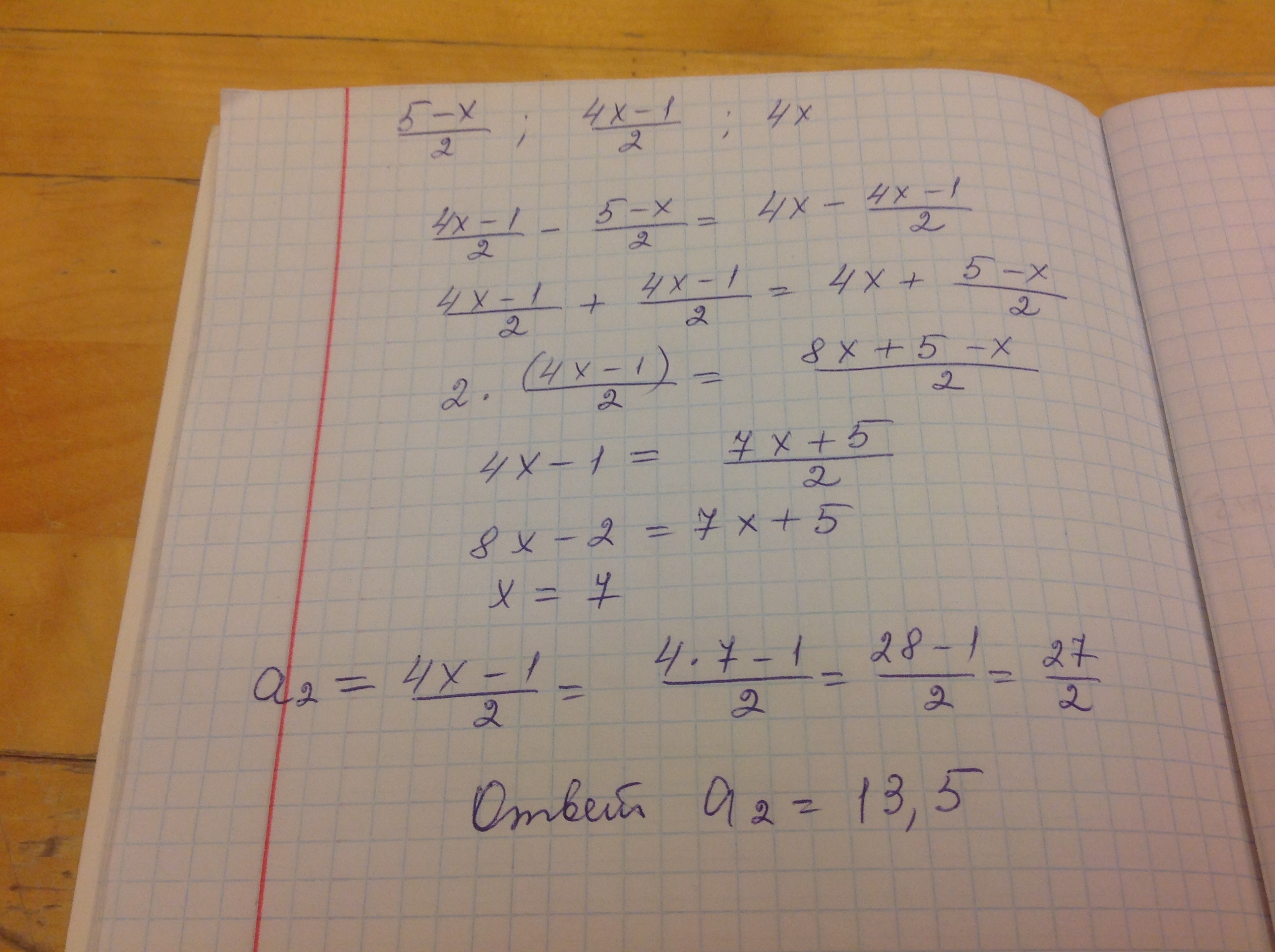 числа (5-x)/2, (4x-1)/2, 4x образуют арифметическую прогрессию. Чему равен второй член этой прогрессии? С подробным решением)))