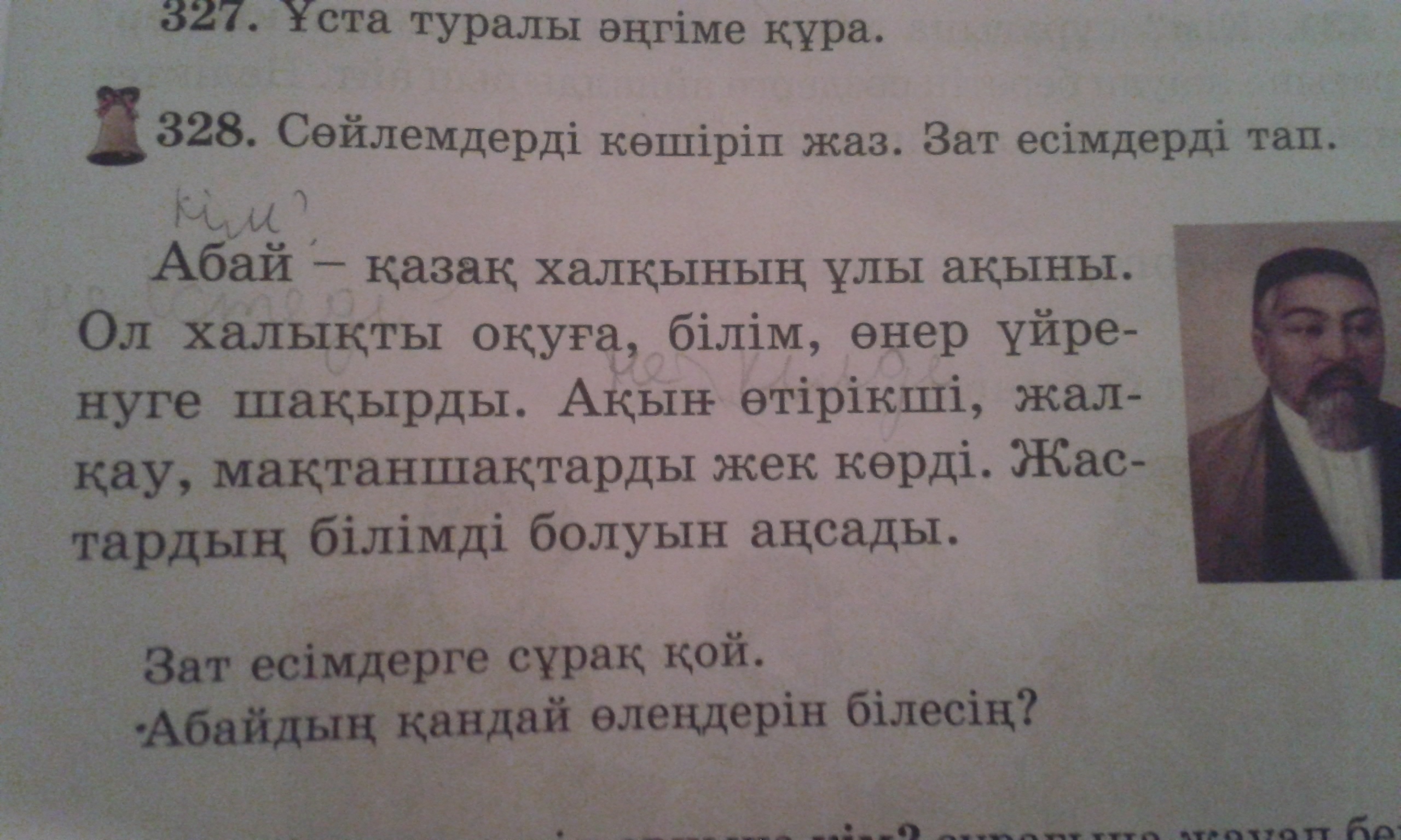 зат есімдер: Абай-кім?, білім-не?, өнер-не?, ақын-кім?, мақтаншақтар-кімдер?, жастар-кімдер?