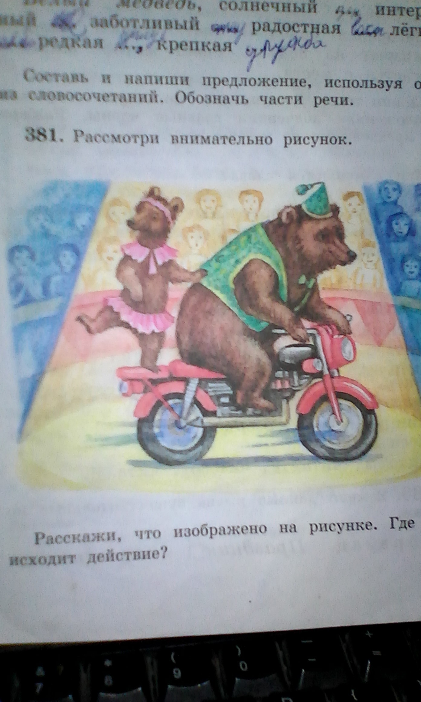 На рисунке изображено цирковое предоставление . Цирковой медведь исполняет номер на мотоцикле , рядом с ним стоит обезьяна и мошет рукой зрителям.