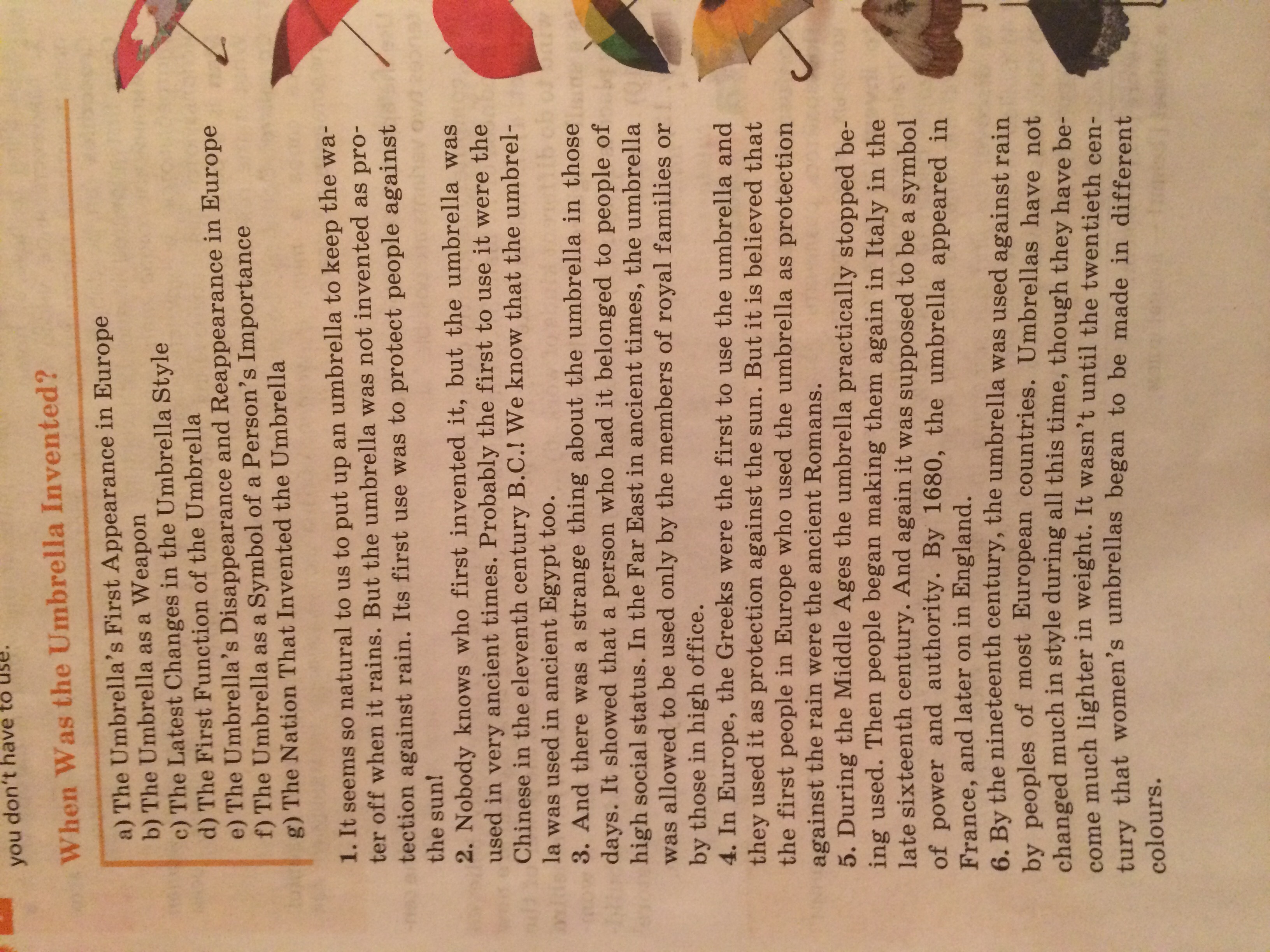 Когда изобрели зонтик?а) зонтик это первое появление в Европеб) зонтик в качестве оружияс) последние изменения в стиле зонтикд) первая функция зонтае) зонта, исчезновение и появление в ЕвропеЯ) зонт как символ важности человекаНация, которая изобрела зонт1. Это кажется настолько естественным для нас, чтобы поставить зонтик держатьЛе не был придуман как пиарзащиты от дождя. Его первое использование было для защиты людей отсолнце!2 никто не знает, кто первый это придумал, но единой системы обмена сообщениямииспользуется в очень древние времена. Вероятно, первым, чтобы использовать этоКитайцы в XI веке до нашей эры! Мы знаем, что umbrelла тоже был использован в Древнем Египте.3. И произошла странная вещь о зонтике в техдней. Он показал, что человек, которому он принадлежал народувысокий социальный статус. На Дальнем Востоке в древние времена, зонтикразрешалось использовать только члены королевской семьи илите на высокой должности.4. В Европе, греки были первыми, чтобы использовать зонтик иони использовали его в качестве защиты от солнца. Но считается, чтопервые люди в Европе, которые использовали зонтик в качестве защитыот дождя были древние римляне5 в Средние века зонтик практически перестал бытьрый используется. Потом люди стали делать их снова в Италииконце шестнадцатого века. И опять же это должен быть символвласти и авторитета. По 1680, зонтик появился вФранция, Аль6 к девятнадцатому веку, зонт против дождянароды большинства европейских стран. Зонтики немногое изменилось в стиле в течение всего этого времени, хотя они должны быть-приходят гораздо легче по весу. Он не был до двадцатого веказонтиков н начали осуществляться в различныхцвета.
