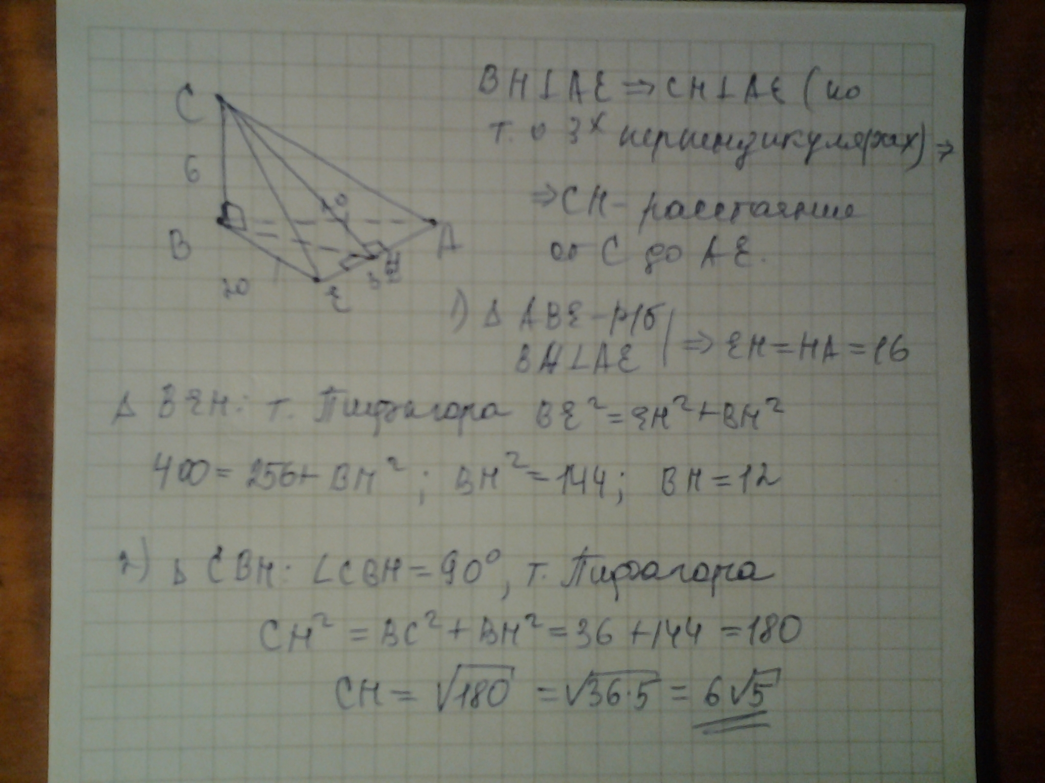 Равнобедренный треугольник ABE находится в плоскости α. Боковые стороны треугольника ABE равны по 20 см, а сторона основания AE=32 см. К этой плоскости проведены перпендикуляр CB, который равен 6 см, и наклонные CA и CE. Вычислите расстояние от точки C до стороны треугольника AE.