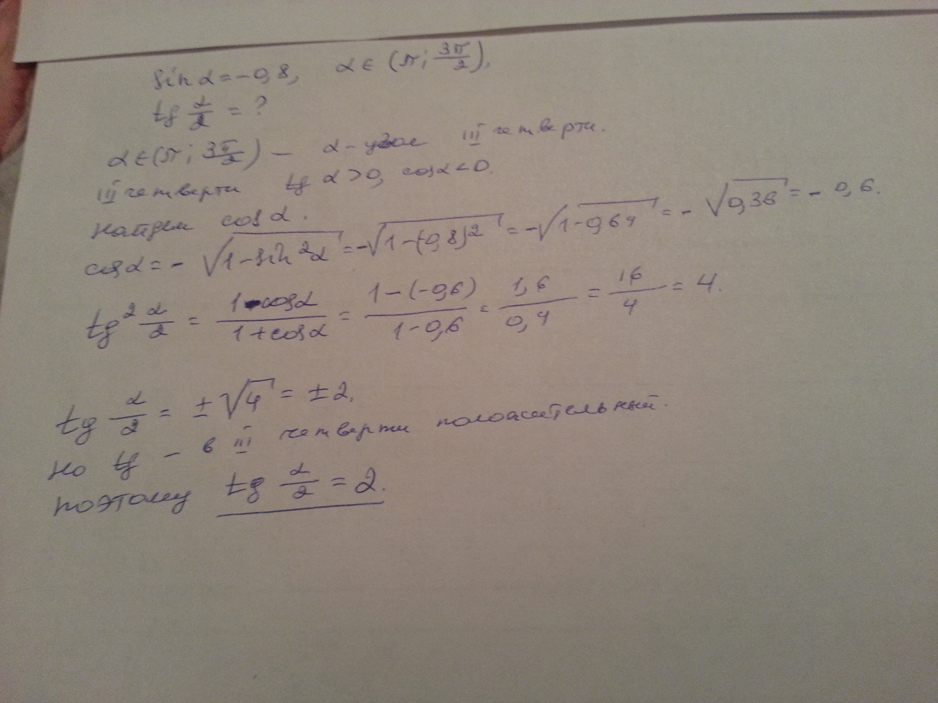 Найдите tg(a2), если sina=-0,8 и pi