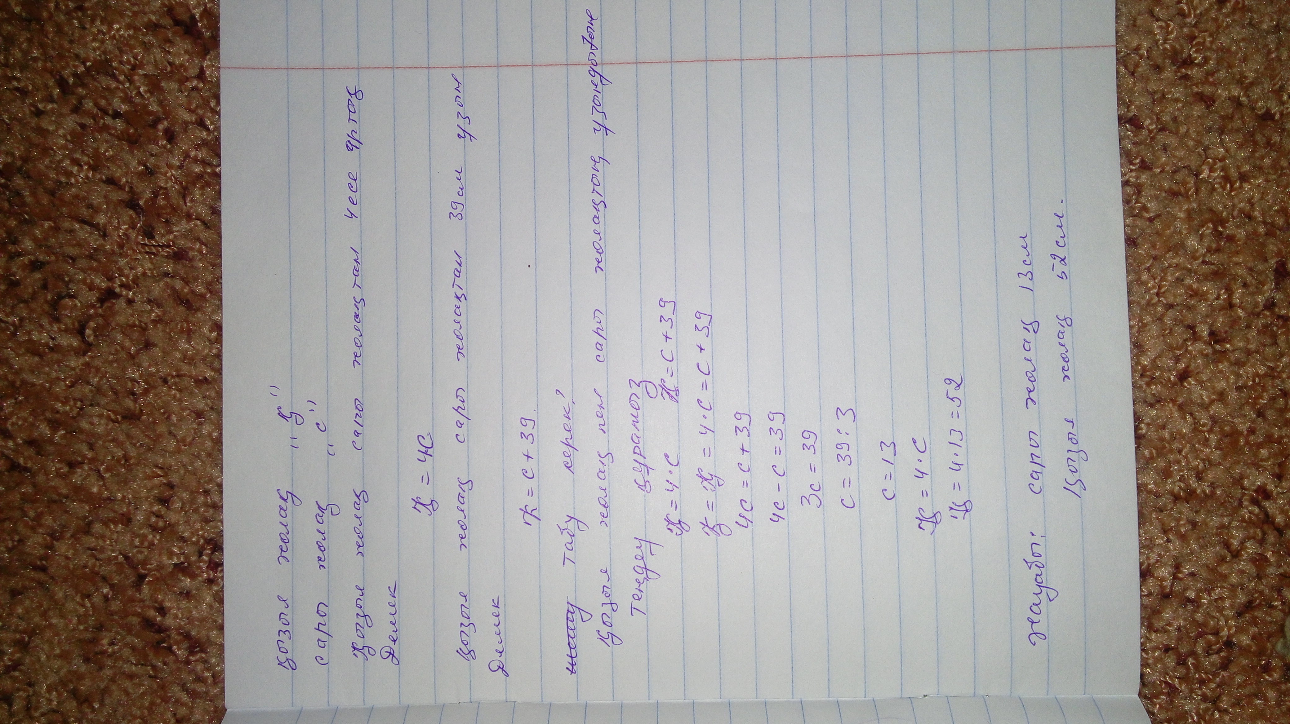 қызыл жолақтың ұзындығы сары жолақтың ұзындығынаң 4 есе артық, ал сары жолақтың ұзындығы қызыл жолақтың ұзындығынан 39 см қысқа. әрбір жолақтың ұзындығын табындар