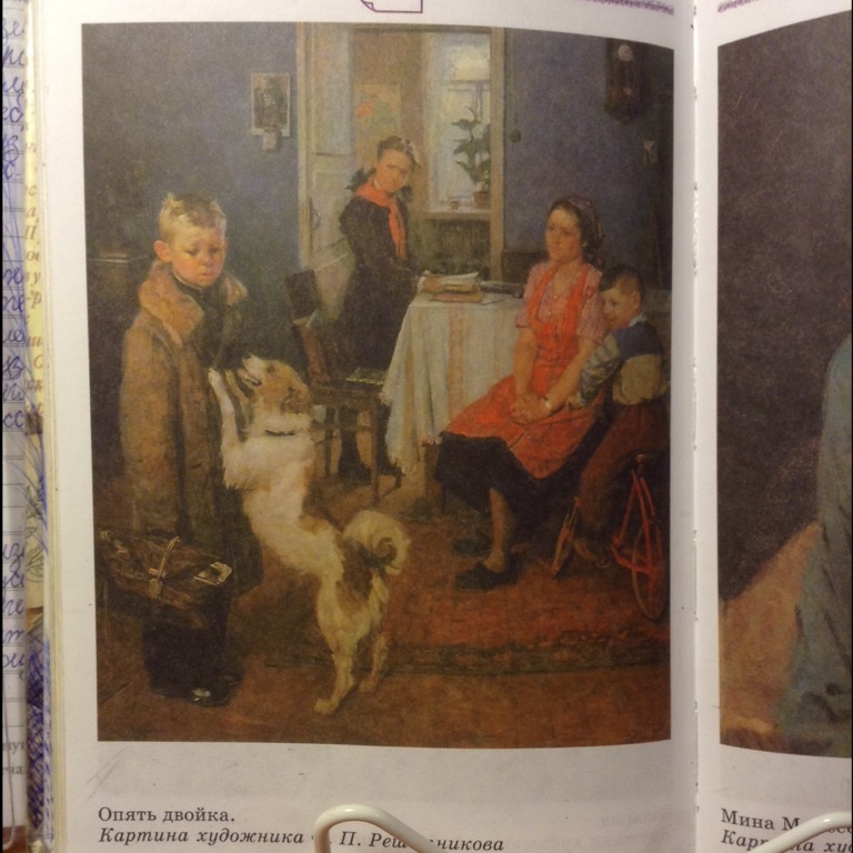 Картина Федора Решетникова "Опять двойка" очень близка к настоящей жизни школьников, поэтому ребята ее часто любят рассматривать и видеть в ней что-то для себя знакомое и близкое.На переднем плане картины изображен мальчишка, лет одиннадцати, светловолосый, в потертом и старом пальто, с портфелем в руке.Портфель пережил многое. Мальчик его перевязал веревкой, потому что у него поломался замок и застегнуть его уже невозможно. Из него видны коньки, которые мальчишка еле запихнул в разодранный портфель. По всей видимости, он провел на улице не мало часов, не желая идти домой. И наверное, долго катался на коньках, с горки , съезжая на этом портфеле. Мальчик не желал быстро возвращаться домой.Ему было неприятно слышать от матери обидные слова и возможно,наказание ,за полученную двойку. Он знал, что все дома расстроятся и не спешил идти домой. Взгляд у мальчика печальный, глаза опущены в пол, он не смотрит на мать и сестру, которая по-видимому, учится хорошо. Мать тихо сидит за столом и переживает за сына.И ему не понять, как можно переживать из-за отметок. Сестра смотрит на брата с упреком и раскладывает свои тетради на столе. Мать сидит ничего не говоря, она понимает, что все ее слова не оказали на него никакого воздействия и она не знает, как дальше быть, чтобы ее сын хорошо учился. Мальчика радостно встречает только его собака.Она ликует и ей все равно, что он получил в школе. Она любит своего хозяина и встает на задние лапы, чтобы приблизиться к нему, и восторженно лает. Младший брат катается по дому на велосипеде, и тоже смотрит на него, немного улыбаясь, ведь он еще не школьник и он не получает двойки. Картина заставляет каждого кто смотрит на нее и размышляет, задуматься над ней, внимательно рассмотреть всех персонажей и всю эту ситуацию.Автор прекрасно отобразил атмосферу ,царящую в этот момент в доме. мне нравится эта картина, она вызывает немножко грусть , но и сладостное удовольствие от правдивости этого сюжета.