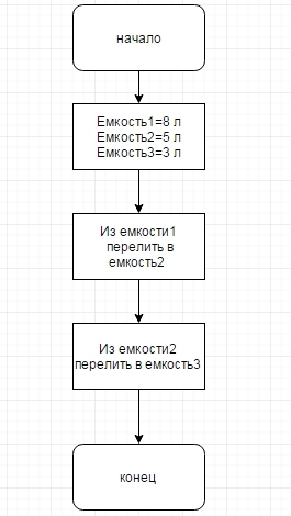 Есть емкости вместимостью 8 литров,наполненная полностью, и две пустые - по 3 и 5 литров. Составьте блок-схему алгоритма получения в одной из емкостей 2-х литров жидкости