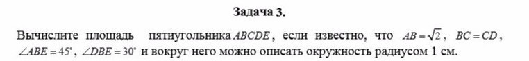 Ключевой момент для решения - теорема синусов, которая в "правильной" формулировке утверждает, что хорда окружности равна произведению диаметра окружности на синус вписанного в эту окружность угла, опирающегося на эту хорду. Из этой теоремы сразу следует, что угол AEB равен 45°, а так как по условию угол ABE равен 45°, треугольник BEA - прямоугольный равнобедренный (угол A- прямой); AB=AE=√2; BE=2, S_(ABE)=1. Поскольку A - прямой, он опирается на диаметр BE, а тогда и угол BDE - прямой, а ΔBDE - прямоугольный с углами 30° и 60°, катетами ED=1, BD=√3 и гипотенузой 2; S_(BED)=√3/2. Осталось разобраться с ΔBCD. Из разных способов рассуждения выберем, скажем, такой. Четырехугольник BCDE - вписанный⇒ сумма противоположных углов = 180°, а так как ∠BED=60°⇒∠BCD=120°, то есть углы равнобедренного по условию треугольника BCD равны 120°, 30°, 30°. Сейчас спокойно можно было бы обойтись без теоремы косинусов, но так приятно лишний раз вспомнить о ней! Итак, обозначив сторону BC-CD=x, получаем