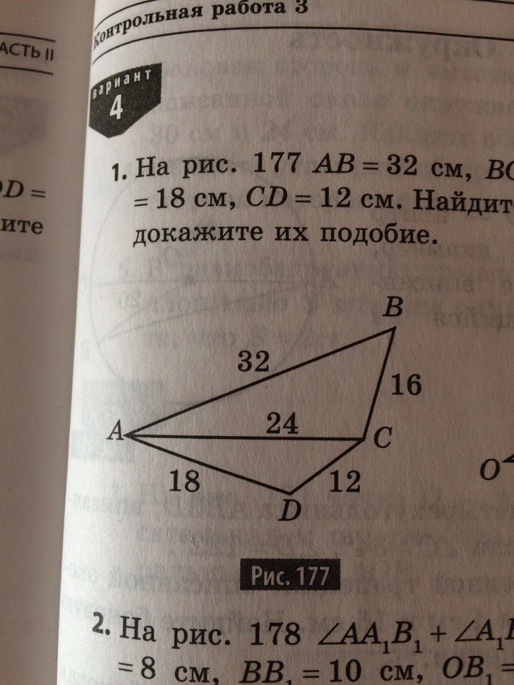 На рис. 177 AB=12CM, BC=16, AC=24CM, AD=18CM, CD=12CM. Найдите подобные треугольники и докажите их подобие