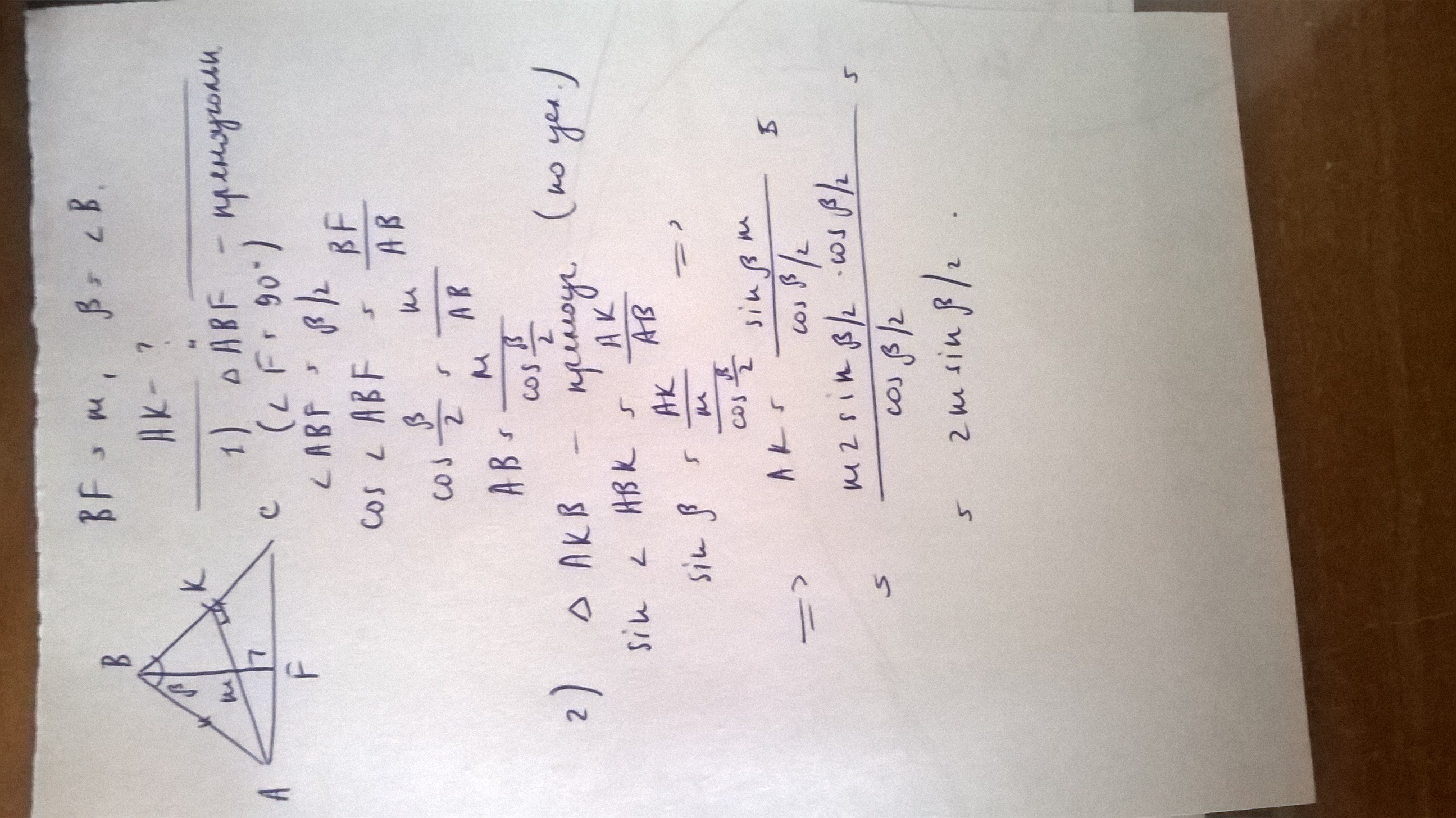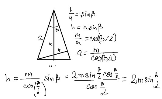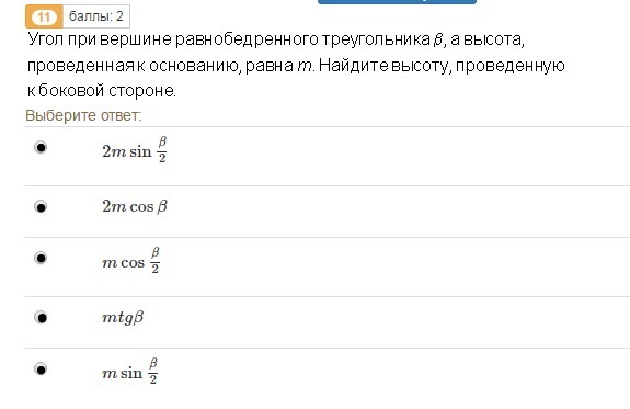 Угол при вершине равнобедренного треугольника бета, а высота проведенная к основанию, равна m. Найдите высоту, проведенную к боковой стороне. (Выберите ответ из прикрепленной картинки)