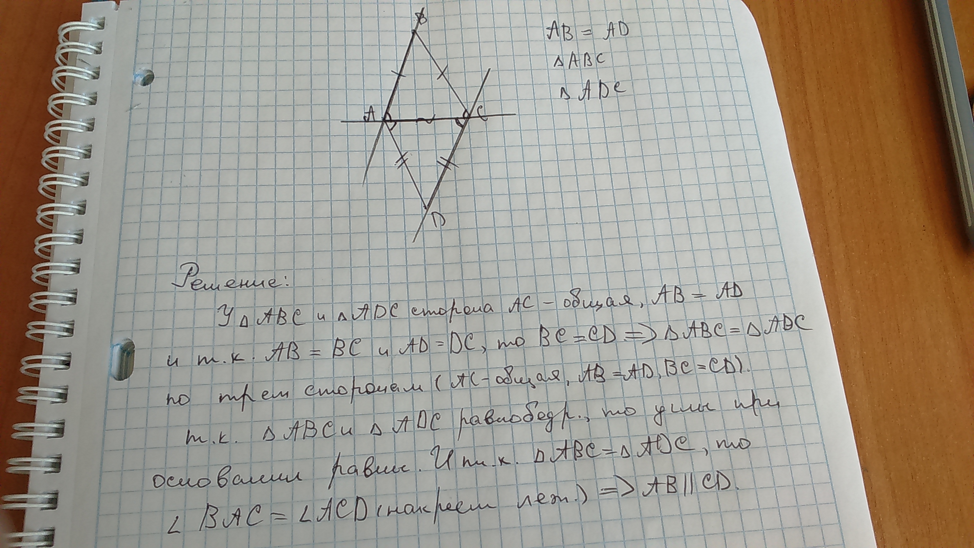 УМОЛЯЮ,ПОМОГИТЕ ПОЖАЛУЙСТА!!!!!!!!!!!!!!!!!!!!!!!!!!!!! равнобедренные треугольники abc и acd имеют общее основание/ вершины b и d расположены по разные стороны от прямой ac . стороны ab и ad равны . докажите что прямые ab и cd параллельны