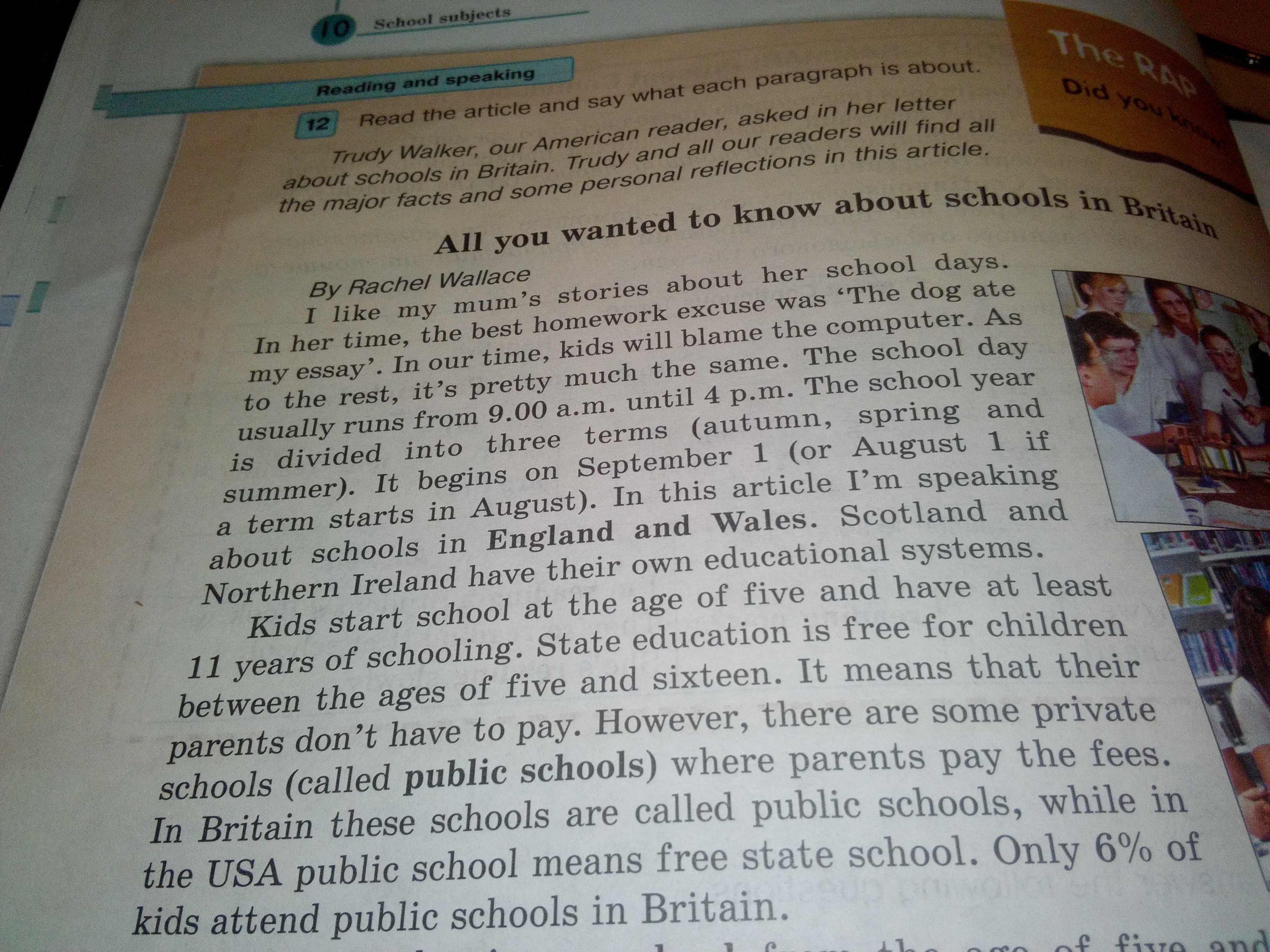 Я люблю мамины истории о её школьной поре. В её время лучшим оправданием, что ты не принёс домашнее задание было "Собака съела моё сочинение". В наше время дети будут винить компьютер. Как и остальное, это тоже самое. Школьный день обычно начинается в 9 часов утра и длится до 4 часов вечера. Школьный учебный год разделён на три периода (осенний, весенний и летний). Он начинается 1 сентября ( или 1 августа, если учебный год начинается в августе). В этой статье я поговорю об Английских и Уэльских школах. Шотландия и Северная Ирландия имеют собственные системы образования.