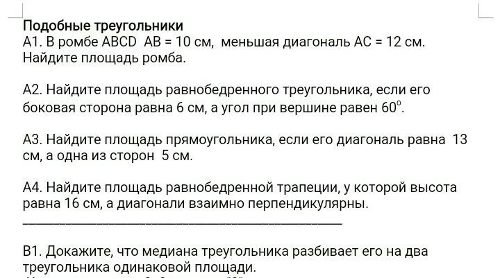 1)Сначала найдем большую диагональ. По теореме Пифагора (гипотенуза - АВ=10 см, катет = 1/2 меньшей диагонали= 6 см) половина большой диагонали равна 8 см. Следовательно площадь ромба = 6 х 8 х 2 = 96 кв. см