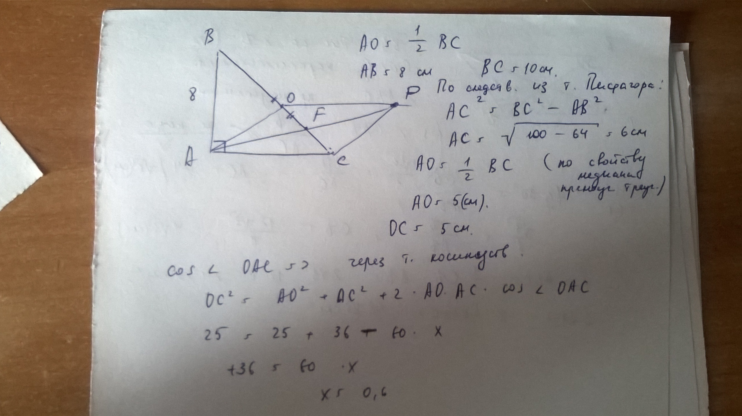 Отрезок АО - медиана прямоугольного треугольника АВС, у которого угол ВАС равен 90 градусов, АВ = 8 см, ВС = 10 см. На отрезках АО и АС как на сторонах построен параллелограмм АОРС. Вычислите косинус угла между прямыми, содержащими диагонали параллелограмма АОРС.