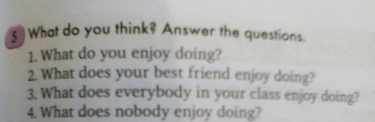 1) I enjoy listening to music, hanging out with my friends, sleeping, shopping, reading, going for a walk.