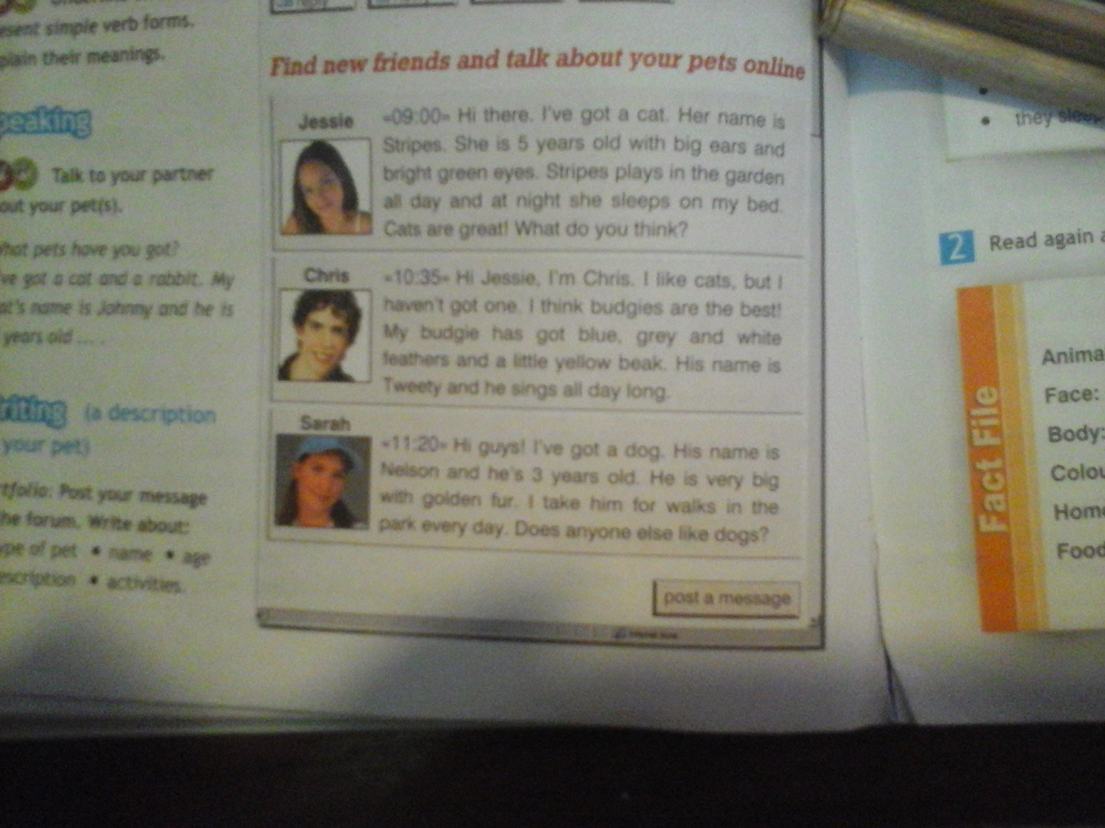 Привет Джесси, я - Крис. Мне нравятся кошки, но у меня их нет. Я думаю, что волнистые попугайчики самые лучшие! У моего волнистого попугайчика есть синие, серые и белые перья и немного желтоватый клюв. Его зовут Твитти и он поет целый день.