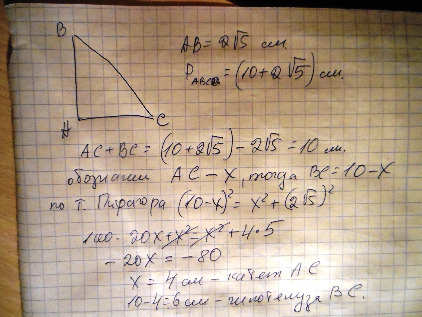 один из катетов прямоугольного треугольника равен 2 квадратный корень из 5 сантиметров а периметр 10 + 2 квадратный корень из 5 сантиметров Найдите второй катет и гипотенузу данного треугольника