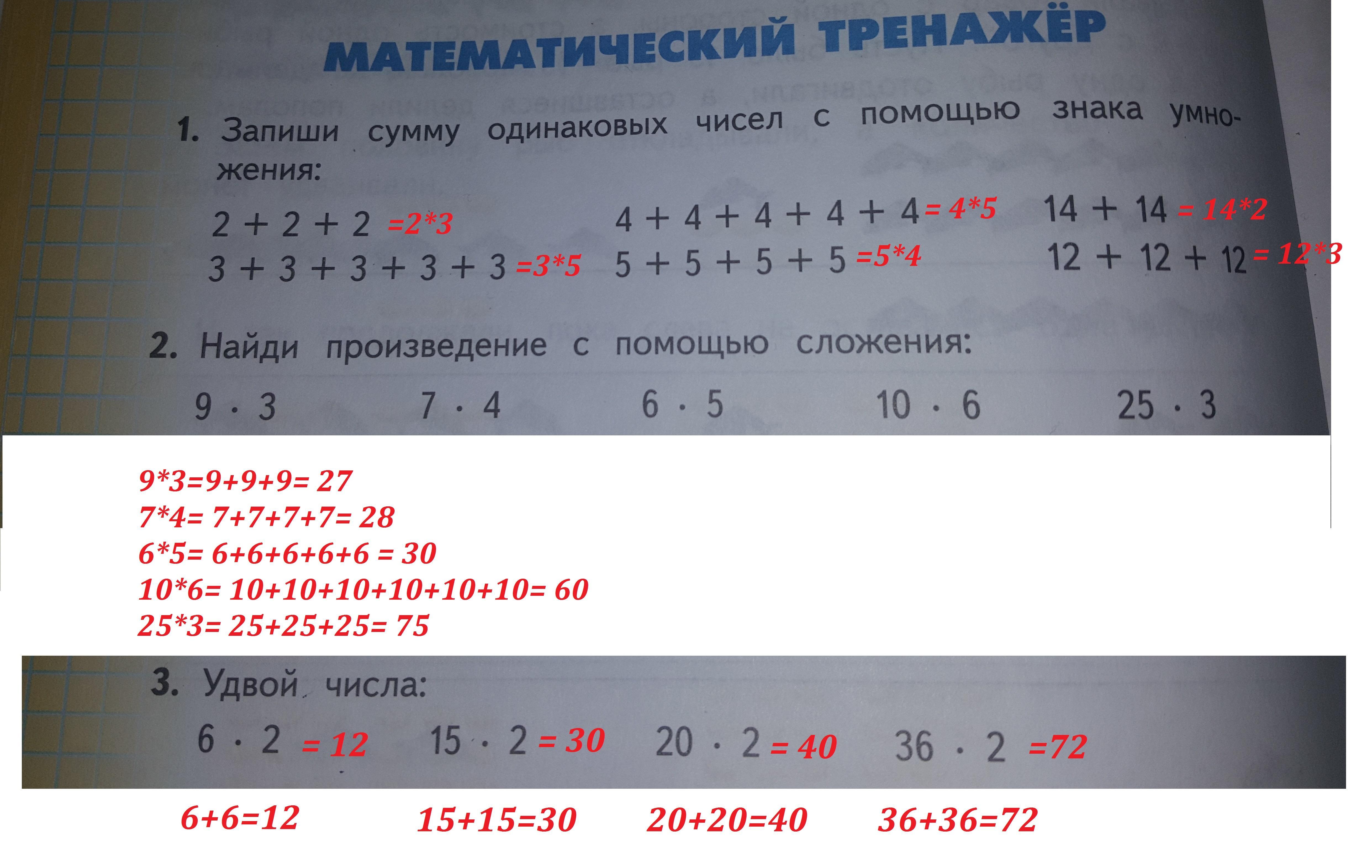 запиши сумму одинаковых чисел с помощью знака умножения 2+2+2 3+3+3+3+3 4+4+4+4+4 5+5+5+5 14+14 12+12+12. найди произведение с помощью сложения 9 . 3 7 . 4 6 . 5 10 . 6 25 . 3. удвой числа: 6 .2 15 . 2 20 . 2 36 .2