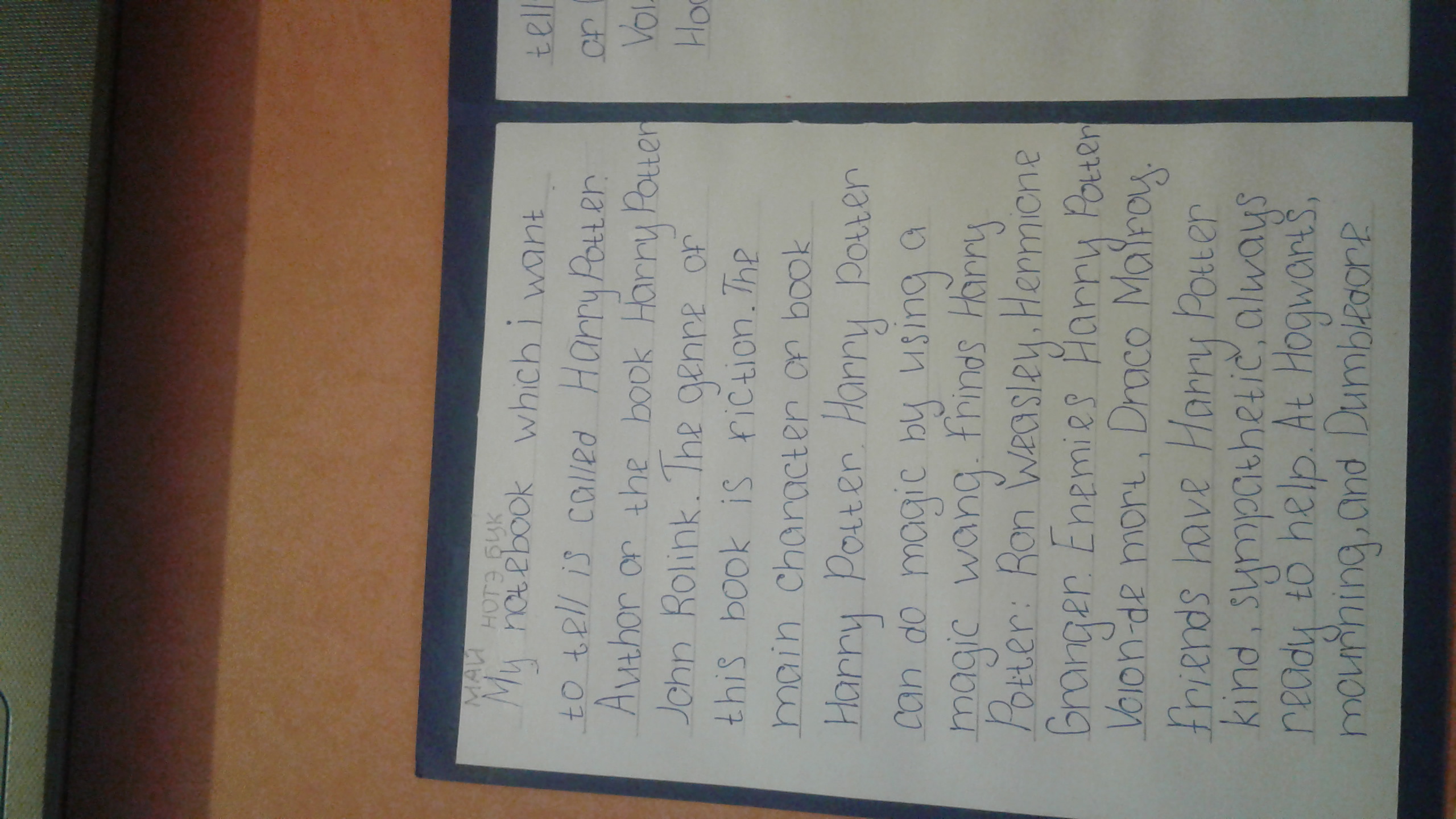 уич ай вонт то тэлл ис колд арри потта. ота оф зе бук арри потта ис джоан роулин. зе дженр оф зис бук ис фикшн. зе мэйн керектер оф бук арри потта. арри потта кэн ду мэджик бай юзинг а мэджик уонд. френс арри потта: рон визли, хермайни грэйнджа. энемис арри потта: волдемоарт, драко малфой. френс хэв арри потта кайнд суюмпатетик олвейс рэди ту хэлп. эт хогуортс морнин энд дамбльдор.